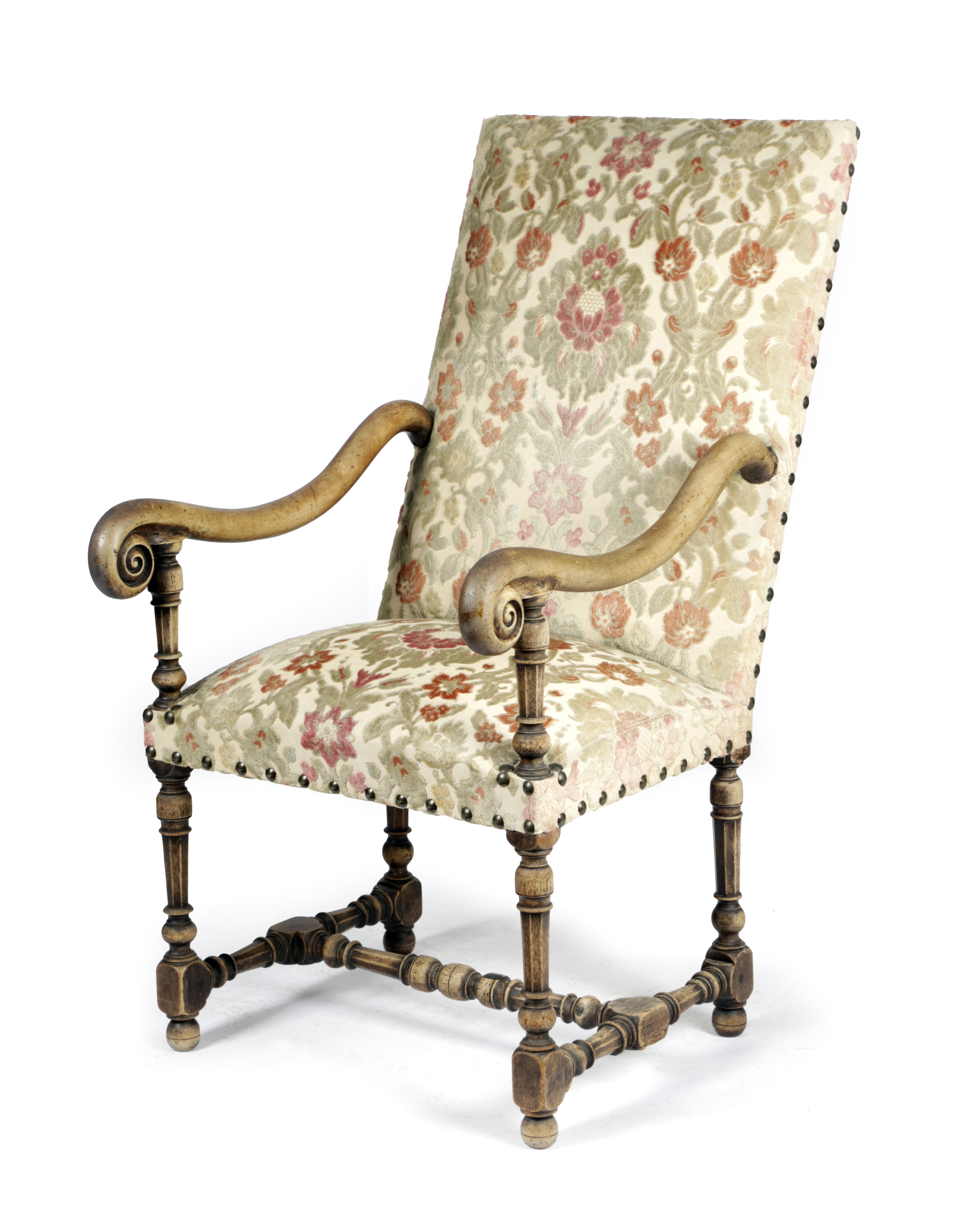 the padded back and seat covered in velvet damask, with scroll arms above turned and faceted supports united by an 'H' stretcher