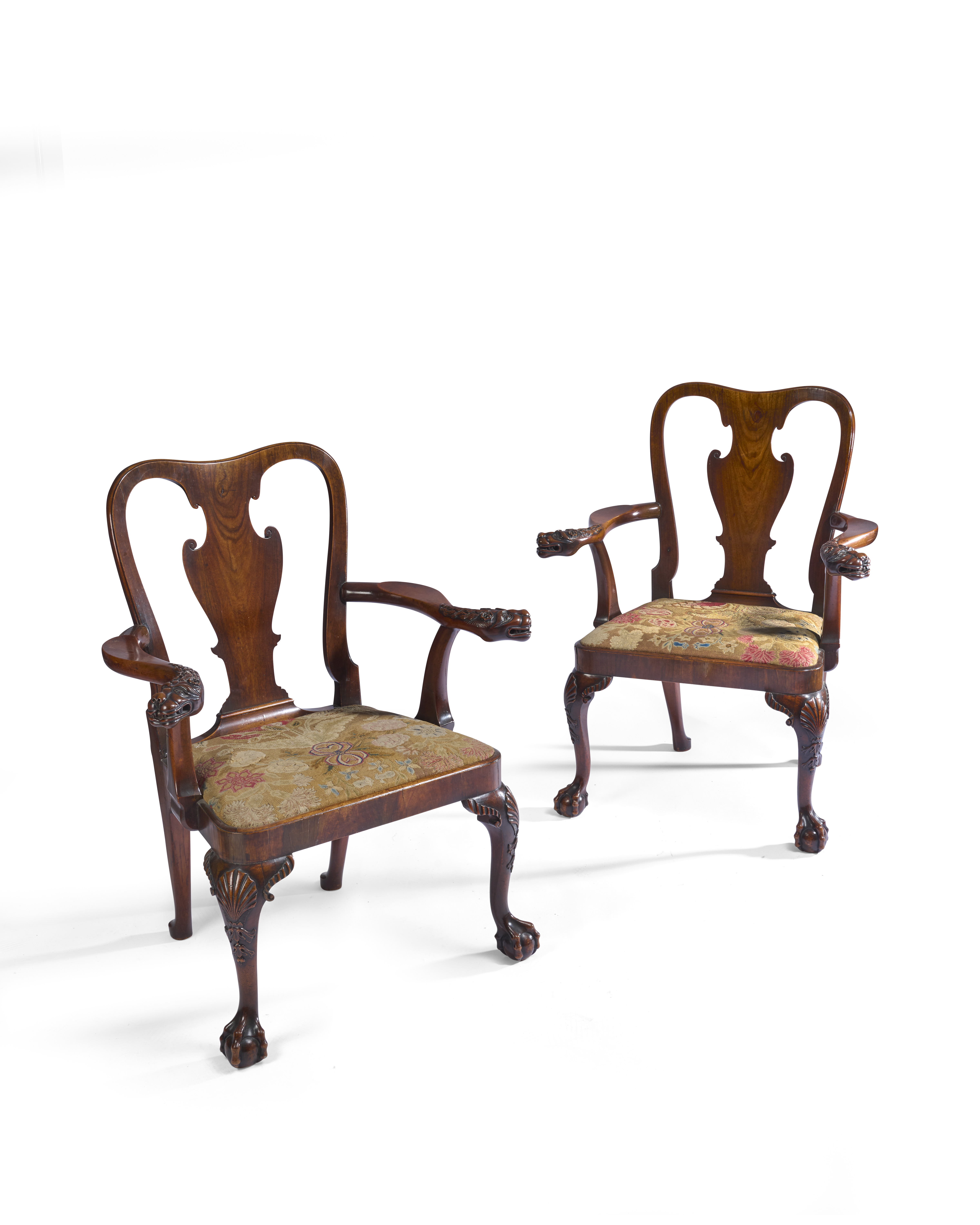 each with a vase shaped splat above a drop-in gros and petit point needlework seat, the scrolling arms with carved lion's head terminals, on shell-capped cabriole front legs and claw-and-ball feet (2)