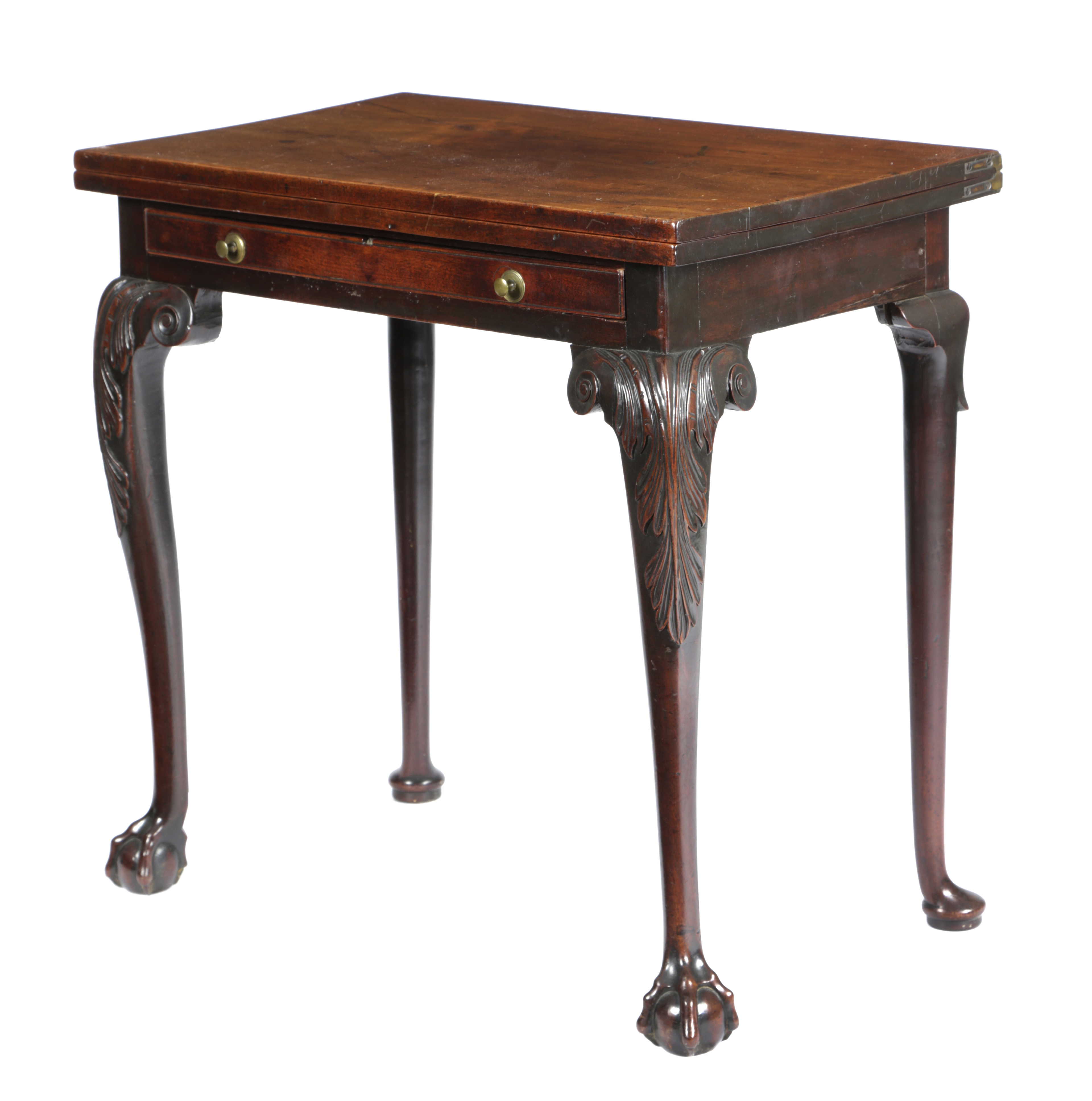 the fold-over top on a single gate support, above a shallow frieze drawer on leaf carved cabriole front legs and claw and ball feet
