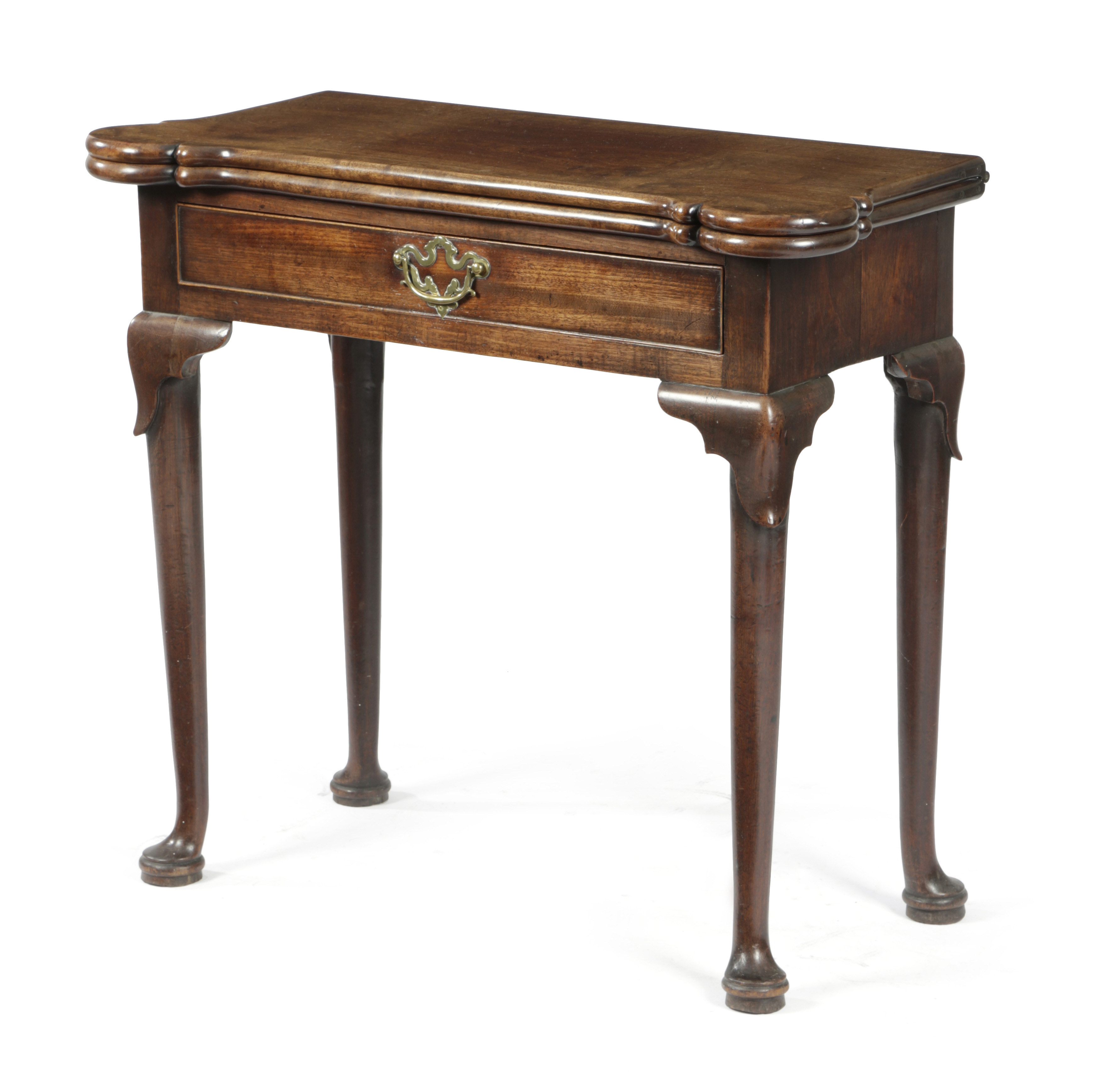 the hinged top with protruding front corners above a frieze drawer on lappet carved legs