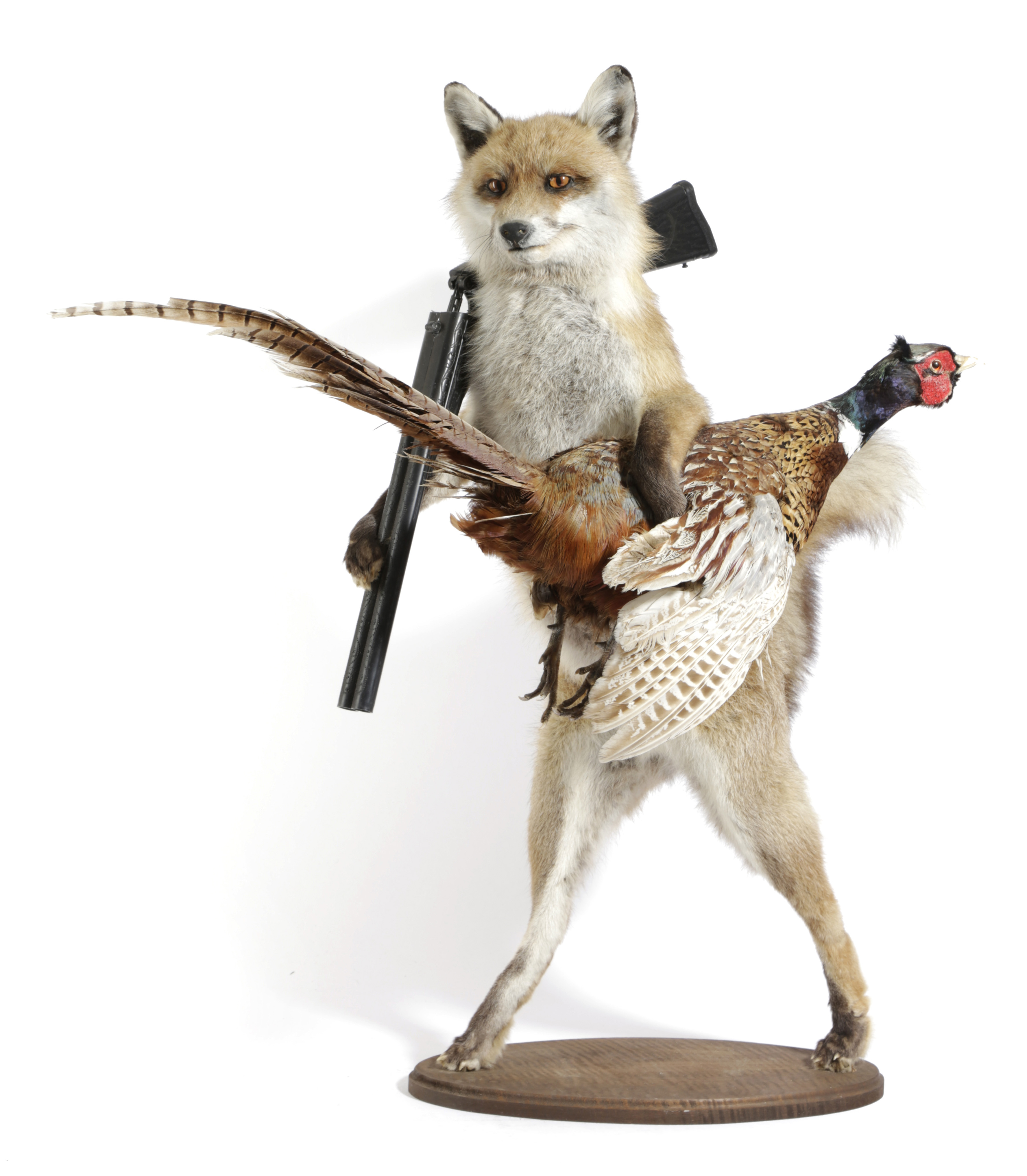 the fox walking with a pheasant under one 'arm', a replica shotgun over the right shoulder, on an oval oak base