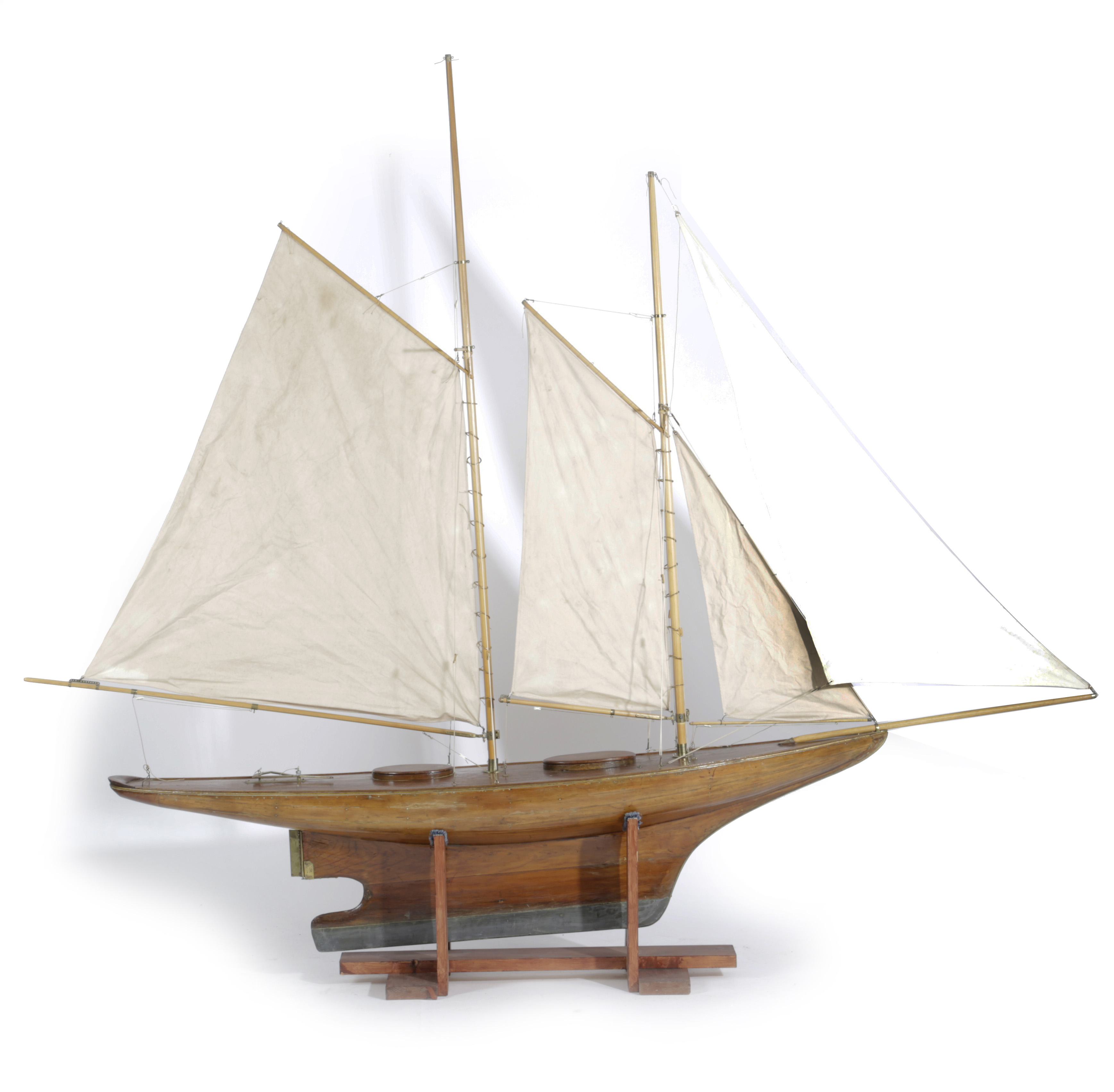with a pine hull, lead keel and cotton sails, one cover titled 'Joan', on a stained pine cradle (2)
