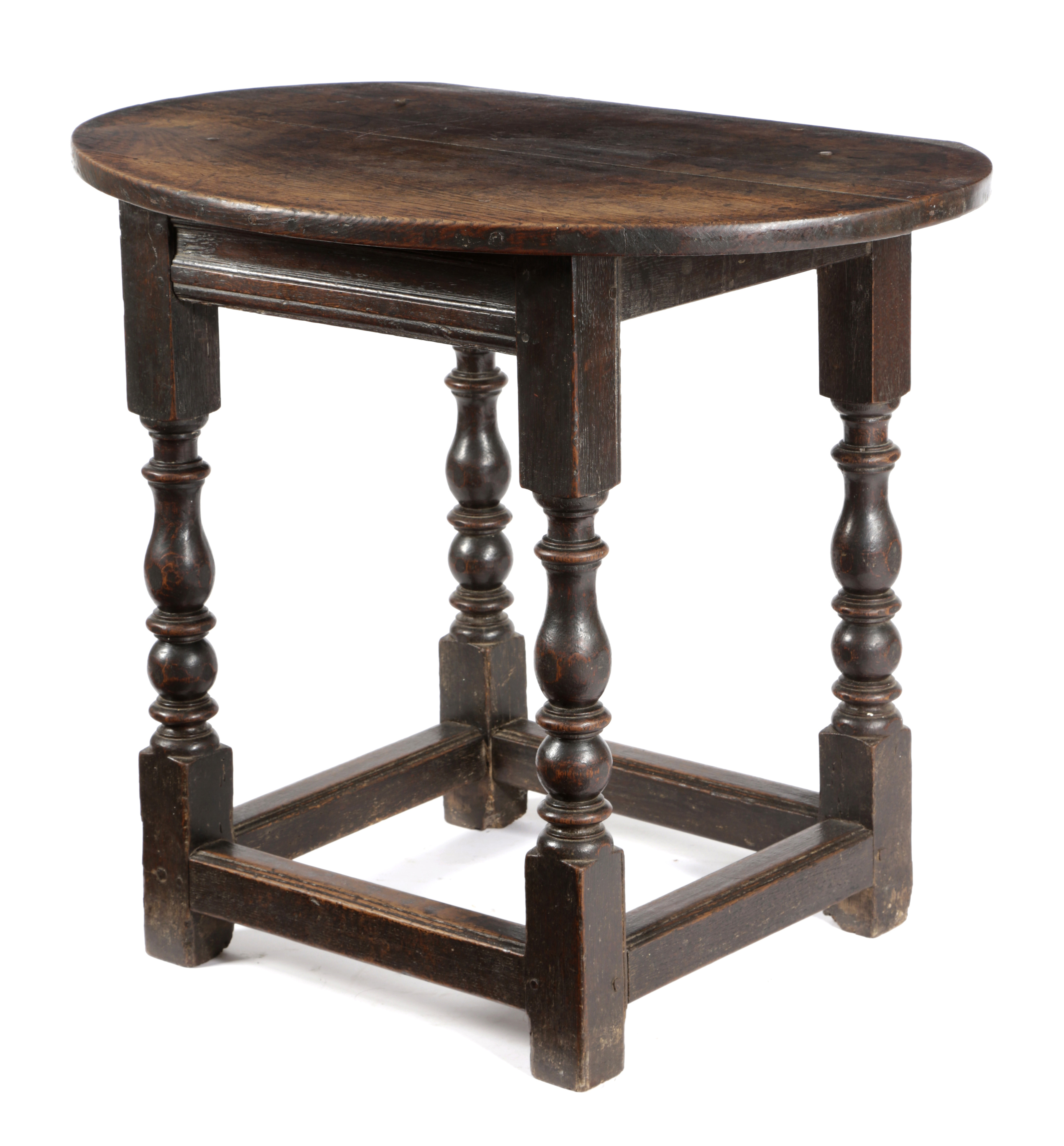 the oval top with a flat back on baluster and ball turned legs, united by peripheral stretchers