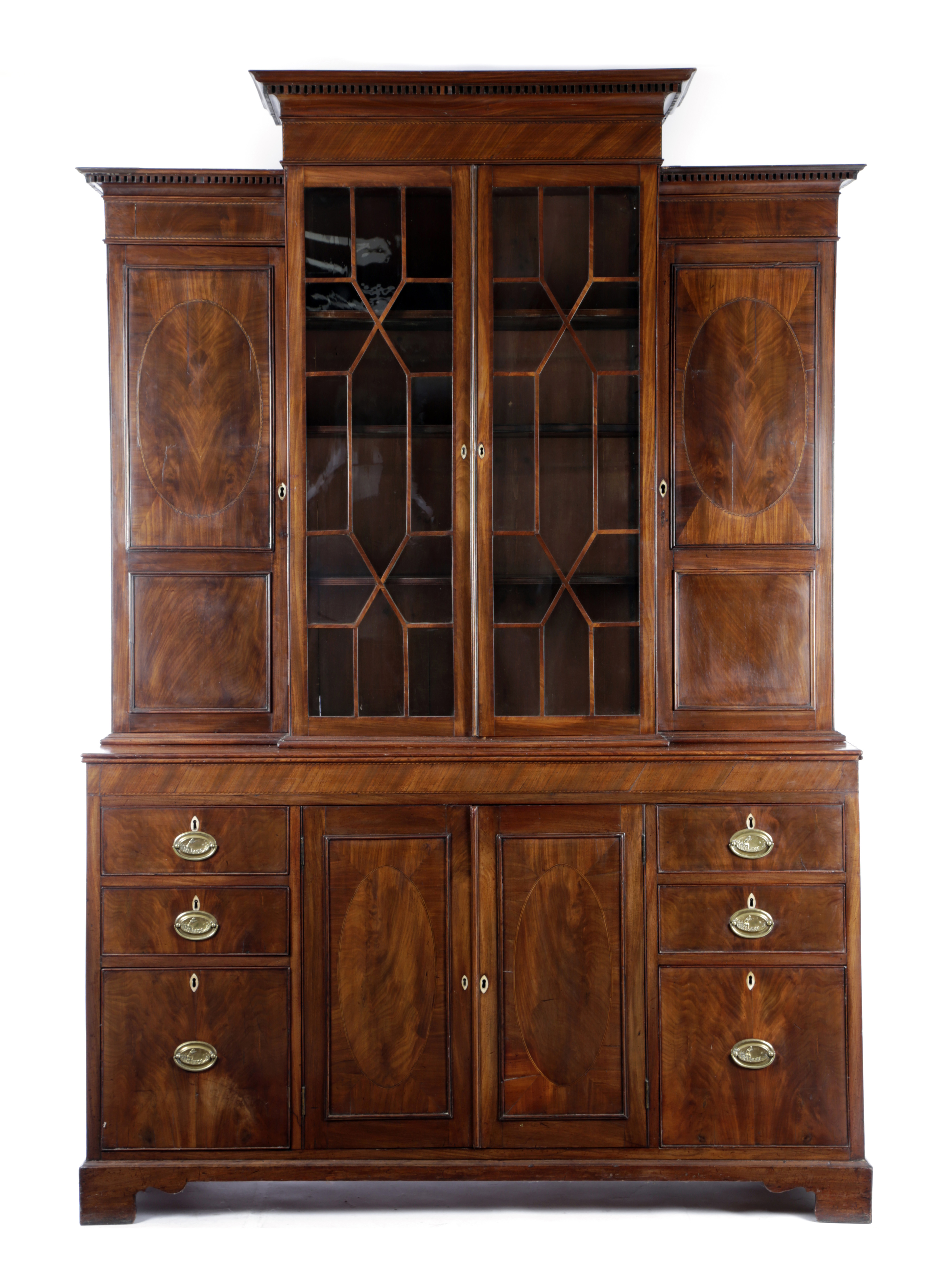 A LATE GEORGE III MAHOGANY BREAKFRONT BOOKCASE