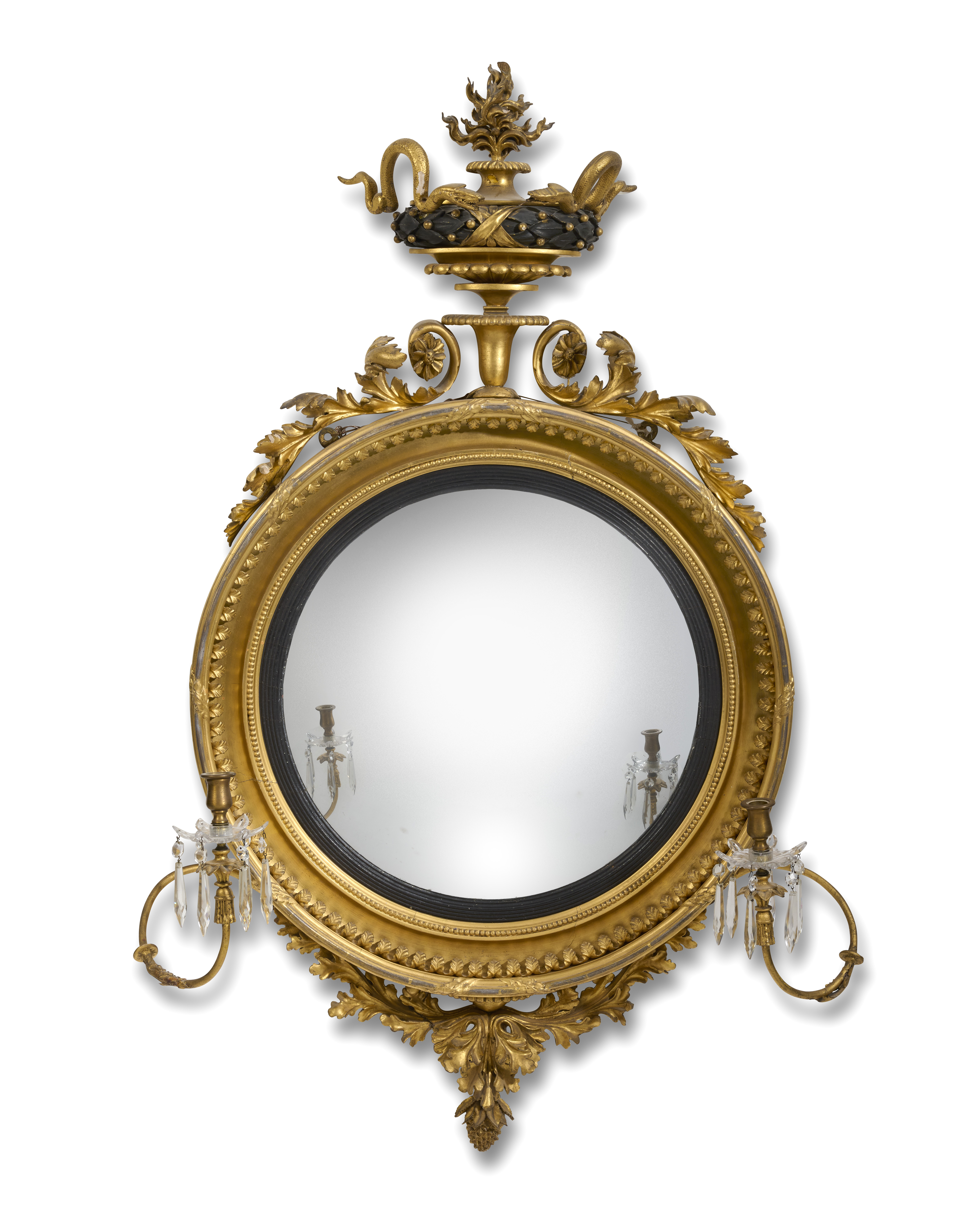 A REGENCY GILTWOOD AND EBONISED CONVEX GIRANDOLE MIRROR