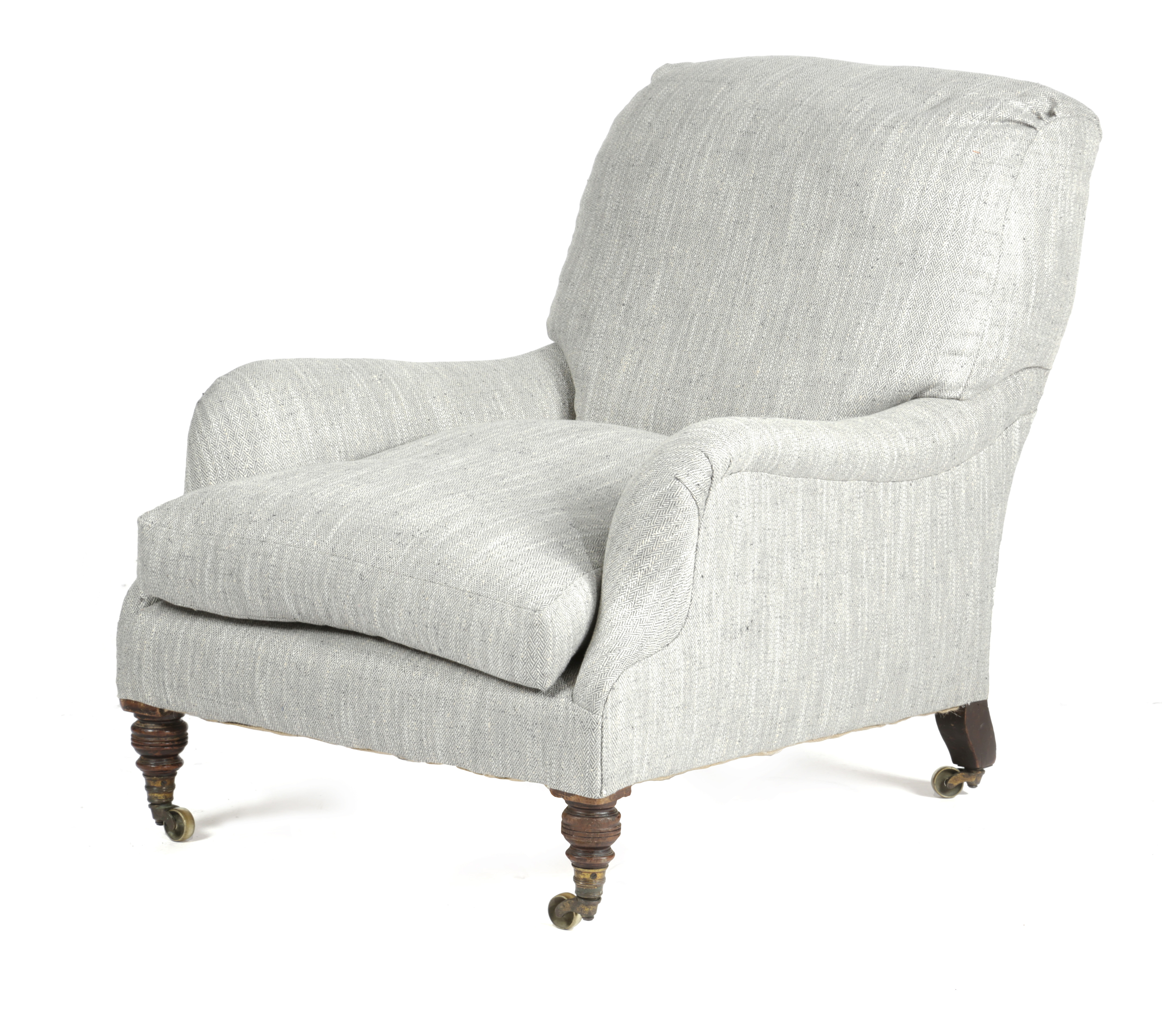 with later grey herringbone style upholstery, on turned front legs stamped 'Howard & Sons London', the inside of the back left leg stamped '19609 1994'