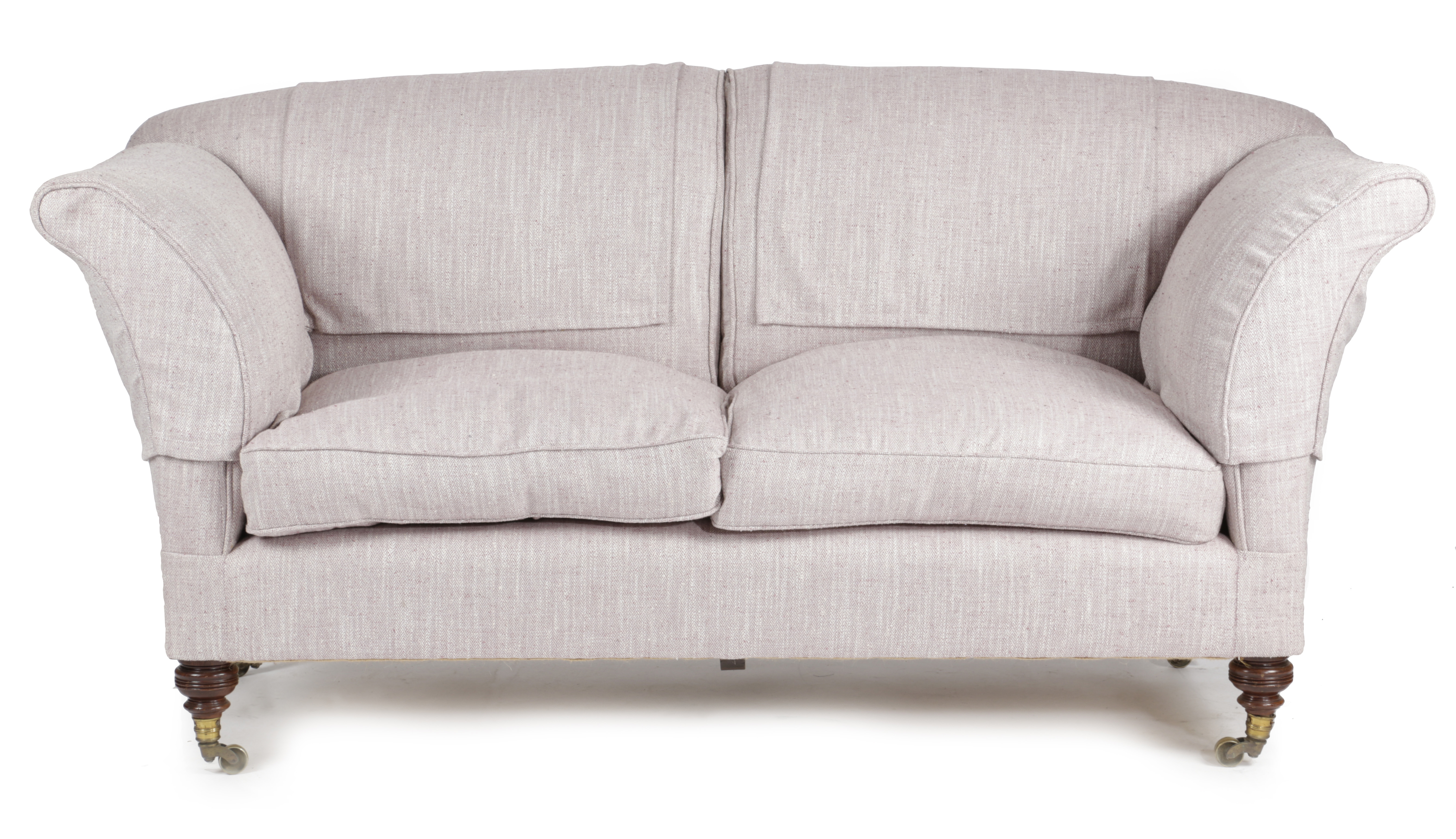 with later herringbone style upholstery, on turned legs, the brass castors stamped 'Howard & Sons Ltd London', the inside of the back left leg stamped '17574 9641'