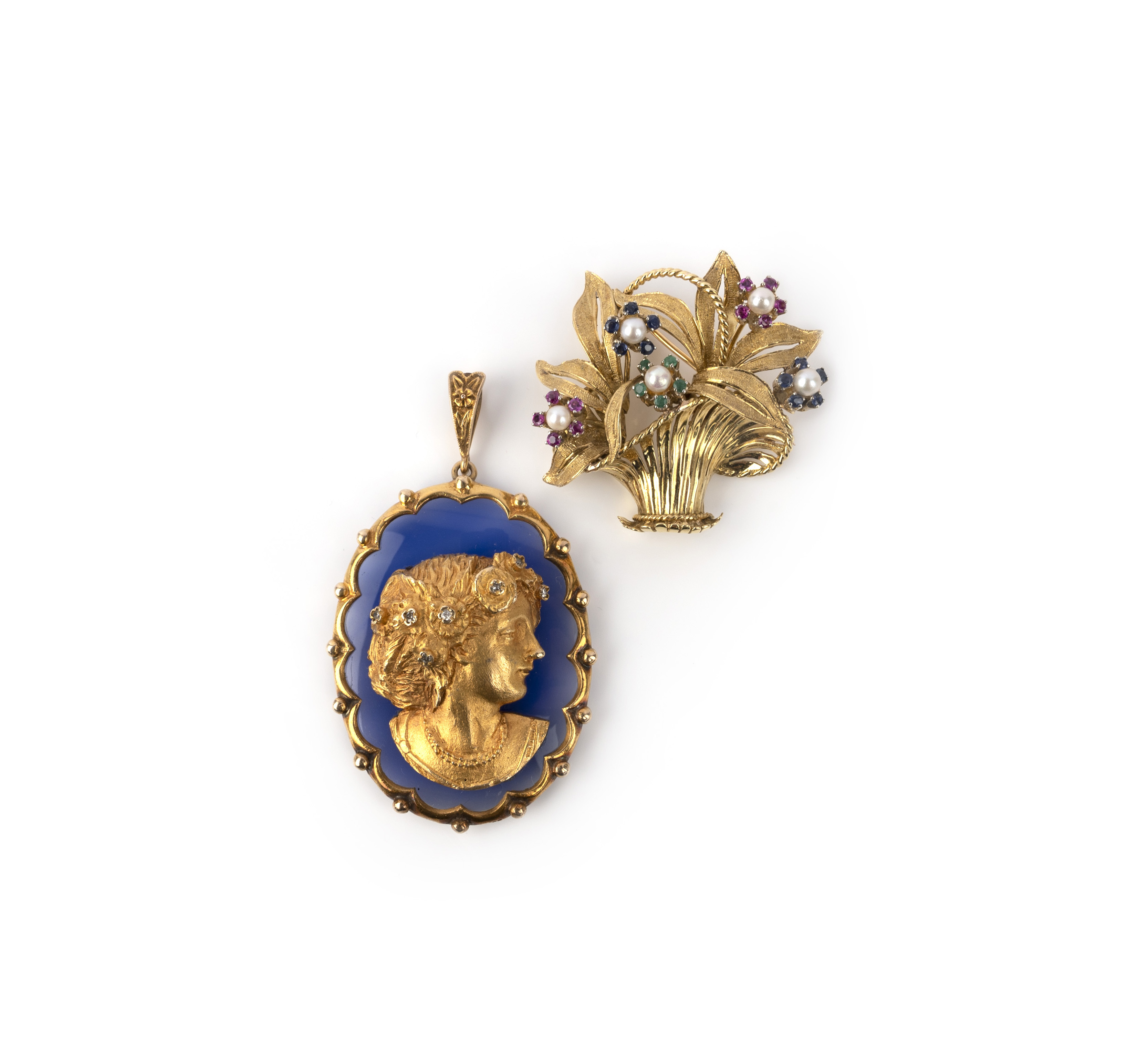 A gold, chalcedony and diamond pendant, circa 1975, and a gold and gem-set brooch, circa 1984, comprising: a pendant depicting a woman in profile in engraved gold, to a ground of dyed blue chalcedony, within a gold border, length 6.8cm, British hallmark for 9ct gold; and a brooch of giardinetto design, set with clusters of emeralds, rubies and cultured pearls, measuring 4.1 x 4.0cm, British import hallmark for 18ct gold