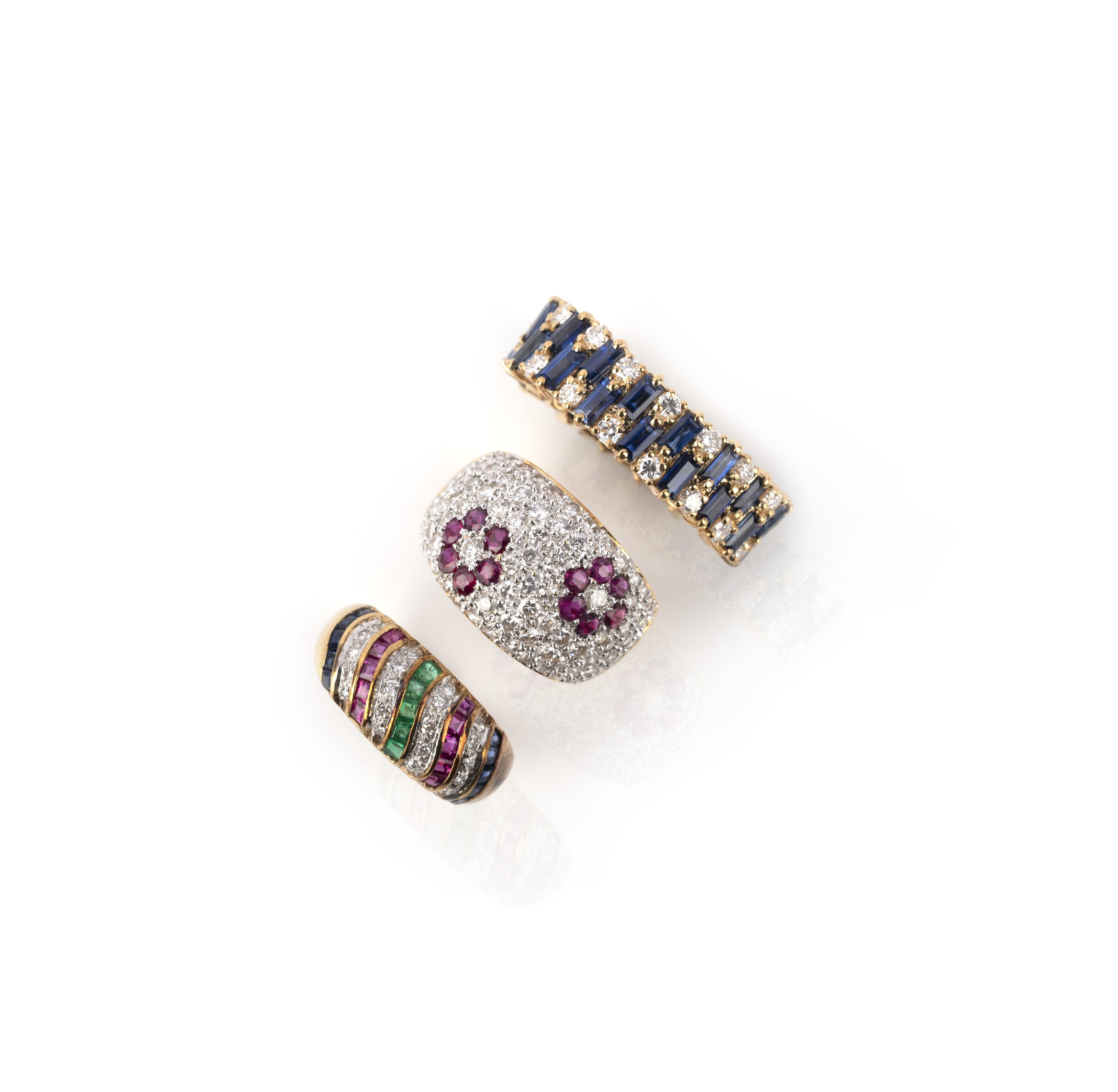 Three gem-set and diamond rings, comprising: a ring of bombé design, pavé-set with brilliant-cut diamonds and floral arrangements of circular-cut rubies, mounted in gold, size M, stamped 18K 750; a ring pavé-set with brilliant-cut diamonds, spaced by bands of calibré-cut emeralds, rubies and diamonds, mounted in gold, size O, stamped 750, numbered 25021; and an articulated gold ring set with step-cut sapphires and brilliant-cut diamonds, size O