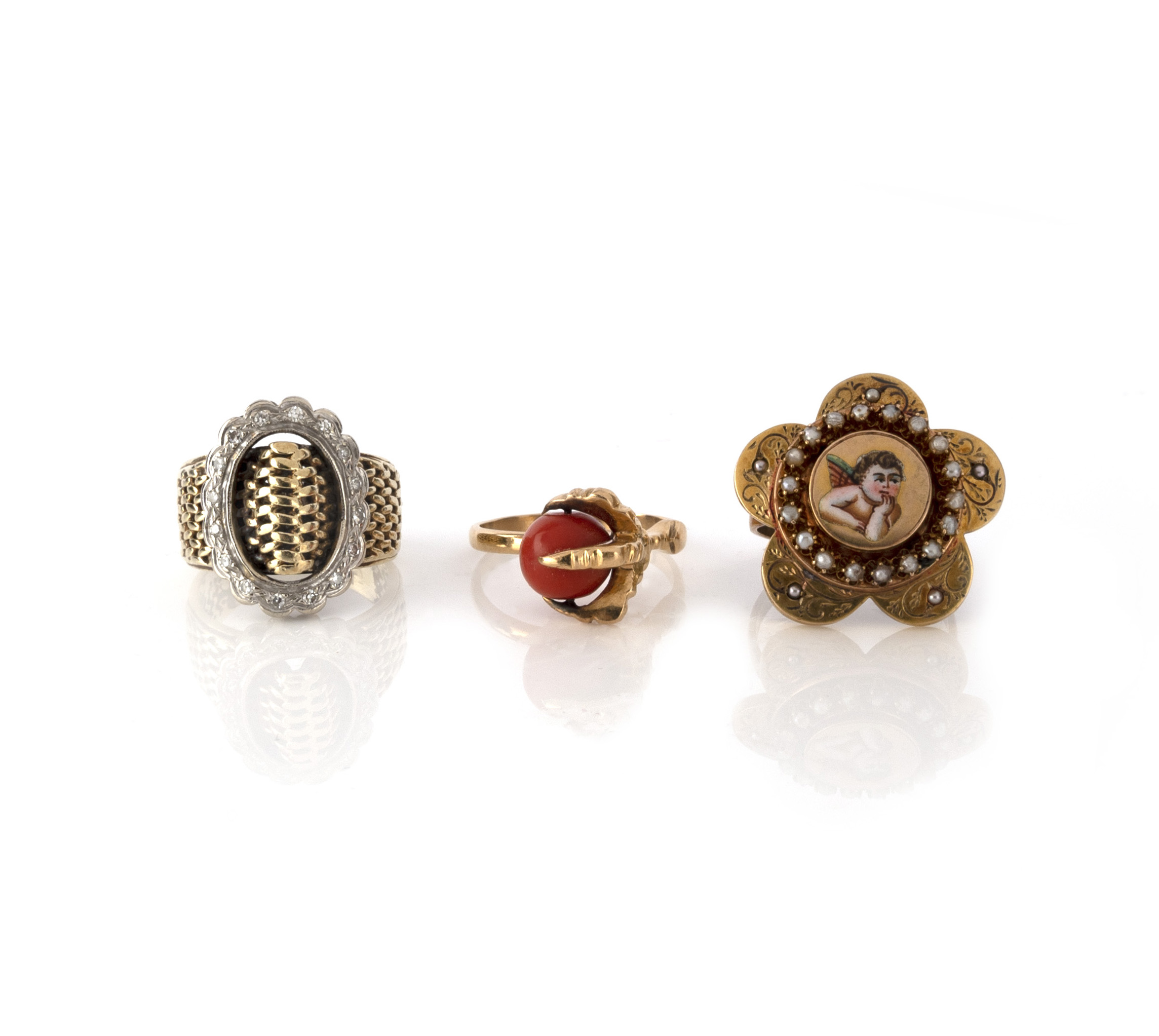 λ A group of three rings, comprising: a ring of buckle design, composed of a textured gold band with an oval band of brilliant-cut diamonds, size N1/2; a ring designed as an eagle's talons gripping a coral bead, size P; and a ring of floral outline, the centre with an enamelled design of a cherub, bordered in seed pearls, size O