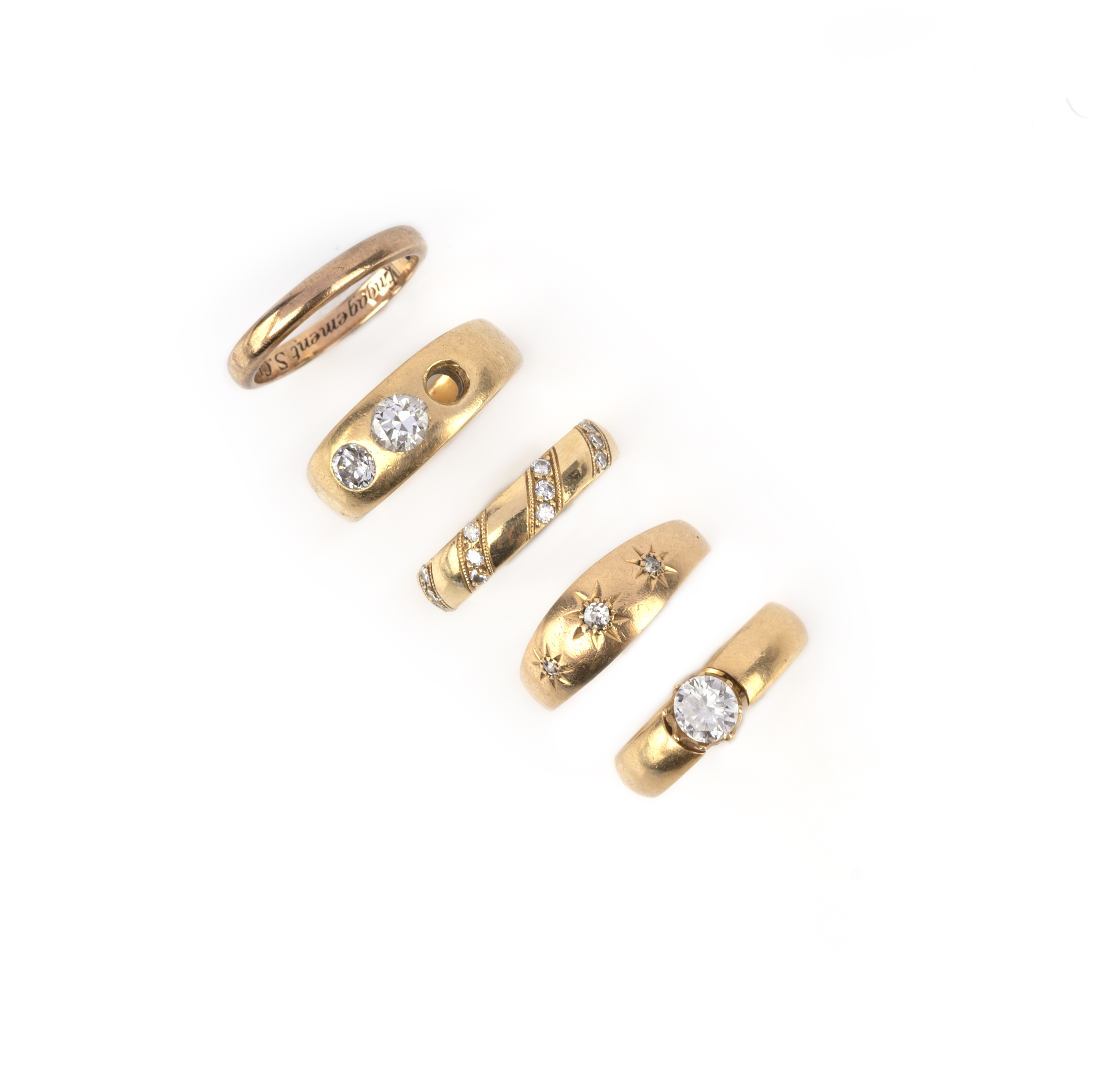 A group of five rings, comprising: a diamond solitaire on a yellow gold band, size J, British hallmark for 18ct gold, date letter 1890, inscription dated 1939, 0.45 carat brilliant-cut diamond loose; a diamond three-stone ring in 18ct yellow gold, size L, one diamond deficient; a band decorated with twists of brilliant-cut diamonds in millegrained borders, size J, British hallmark for 18ct gold; a gold ring set with cushion-shaped diamonds in star surrounds, size M1/2, British hallmarks for 18ct gold, 1902; and a plain gold wedding band, the interior with a dedicatory inscription, size K, British hallmark