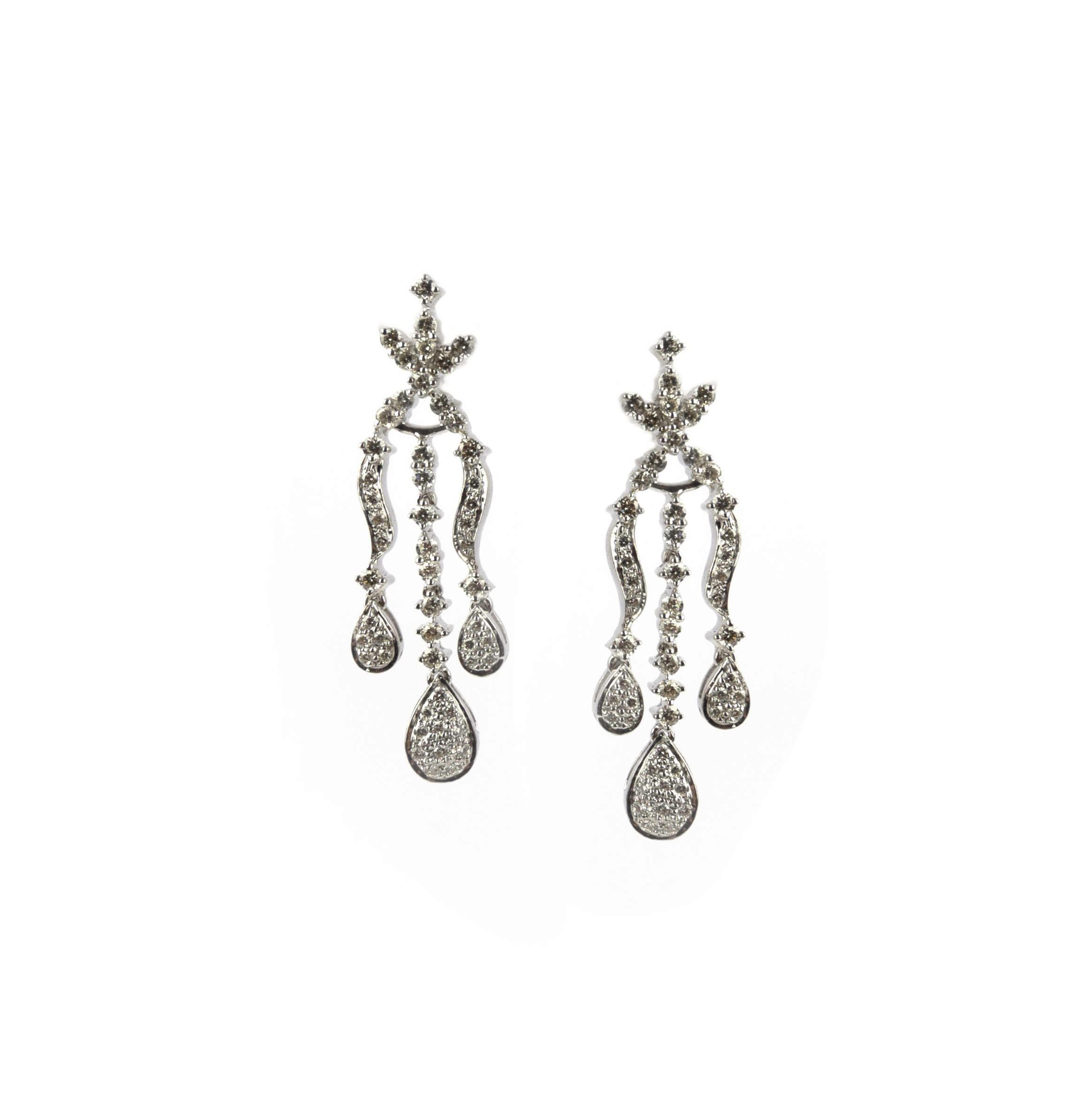 A pair of diamond drop earrings, set with graduated round brilliant-cut diamonds, with three articulated drops to the terminals in white gold, post fittings, length 4.5cm