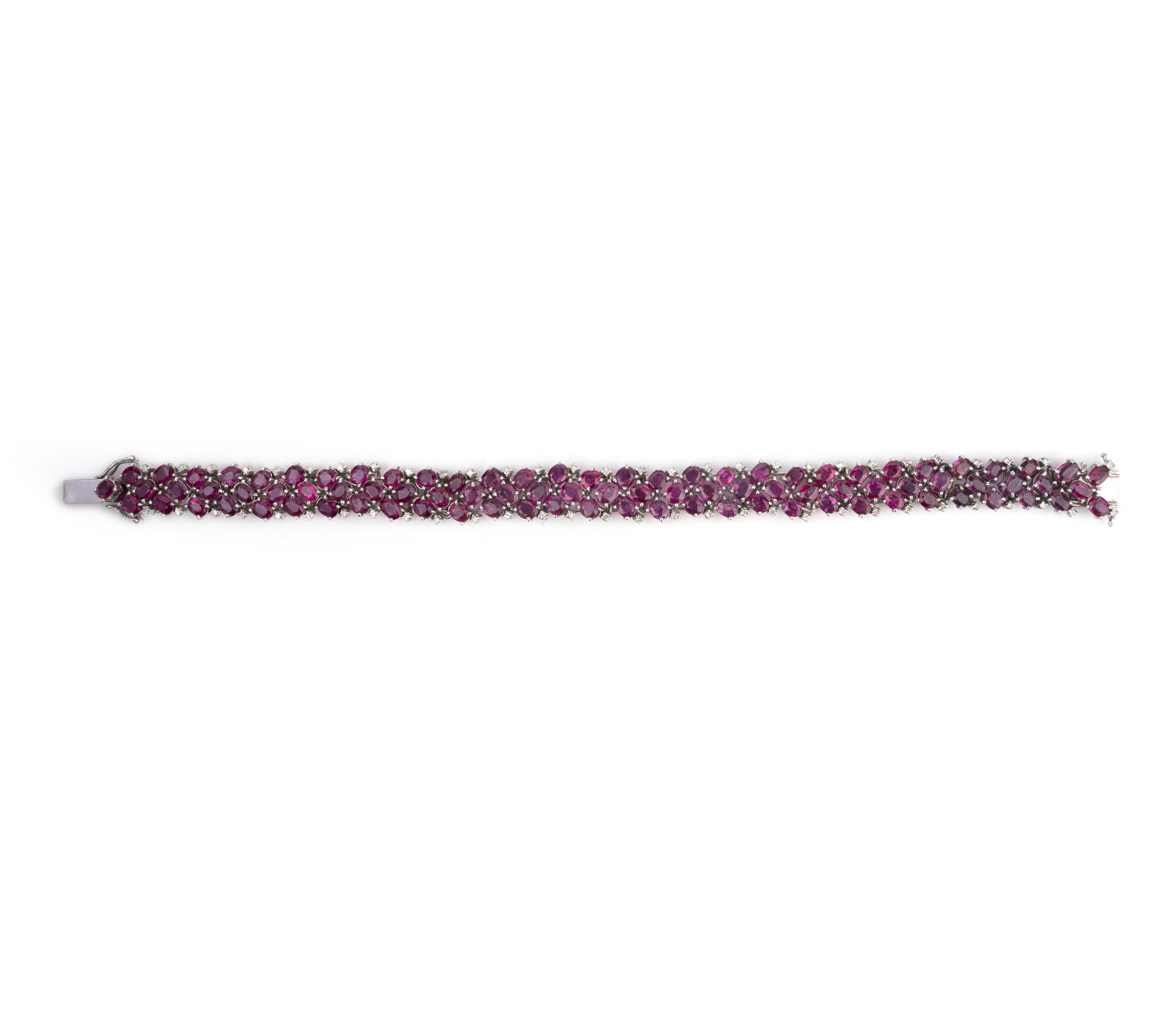 No reserve - a ruby and diamond bracelet, the articulated strap set with oval rubies totalling approximately 13.00 carats, accented with brilliant-cut diamonds, length 20cm, stamped 14K