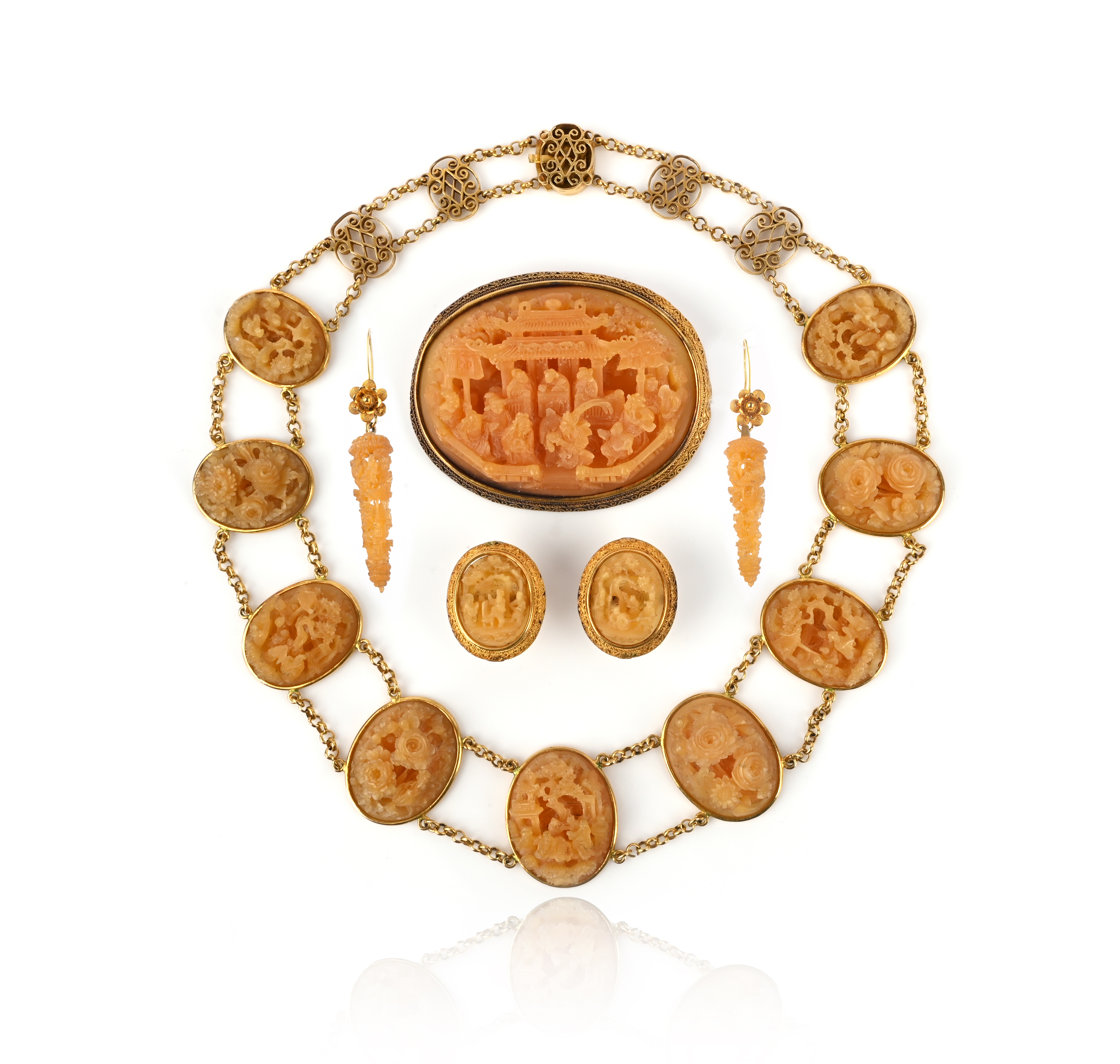 λ A hornbill parure, early 20th century and later, comprising: a necklace, a pair of earrings and a brooch, each set with panels of hornbill intricately carved with various Chinese mythological scenes and floral sprays, mounted in gold, brooch 5.8 x 4.6, length of earrings 2.2cm each, post fittings, necklace length 35cm, case