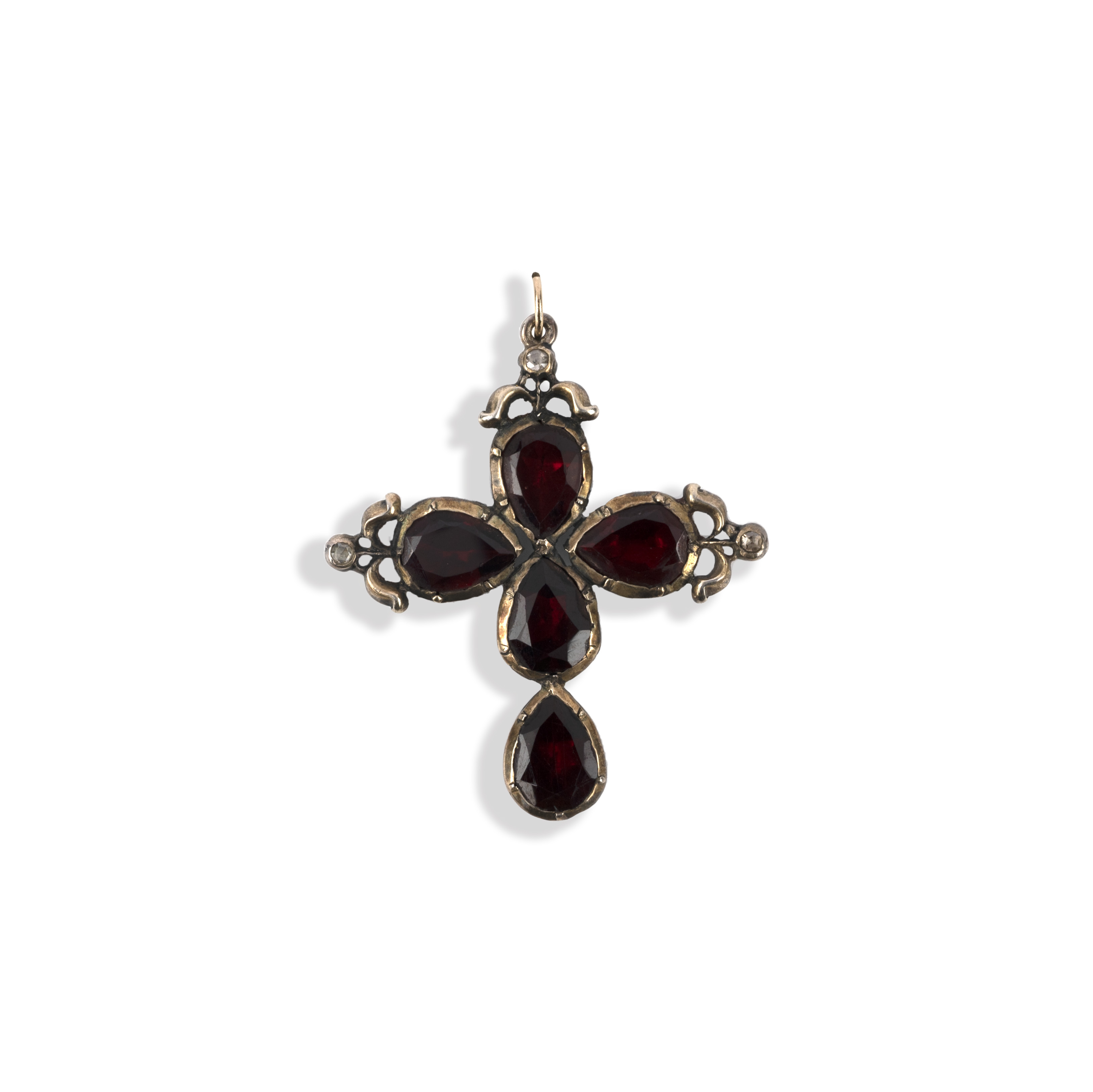A garnet and diamond pendant, 19th century, of cross design, set with foil-backed pear-shaped garnets, the reverse set with rose-cut diamonds, mounted in silver and gold, length 4.7cm