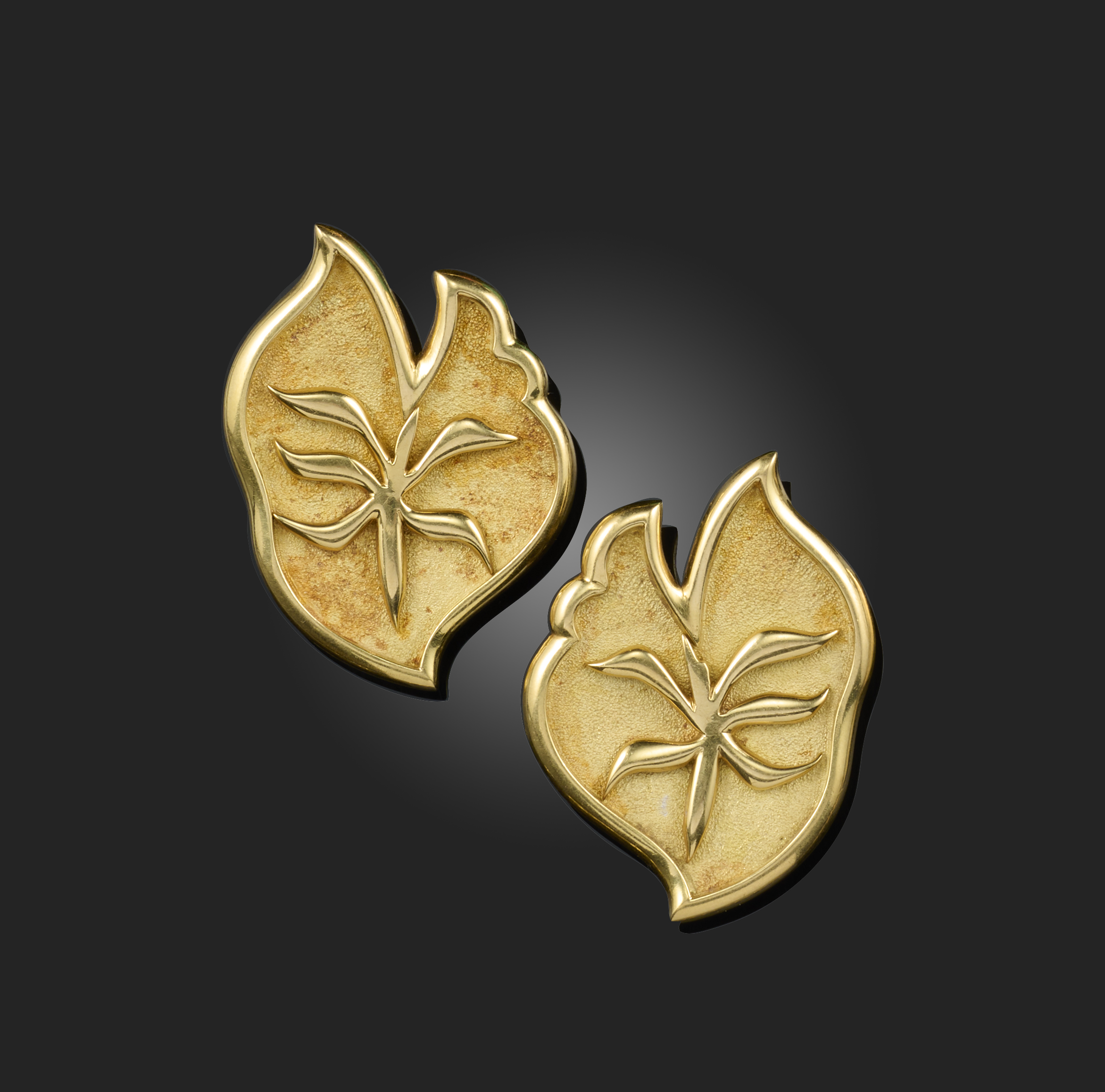 No reserve - a pair of gold ear clips, each designed as a leaf of an arrowleaf plant