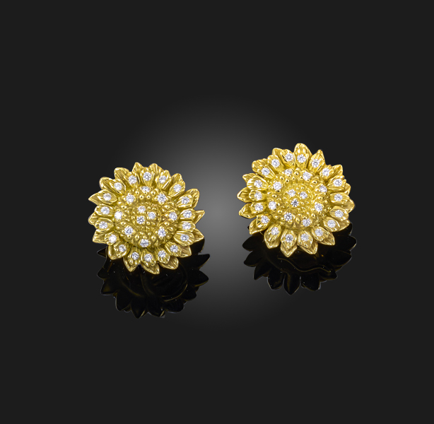 No reserve - a pair of diamond earrings, each designed as a sunflower in gold, set with brilliant-cut diamonds, diameter 1.5cm each, stamped 18K, clip and post fittings