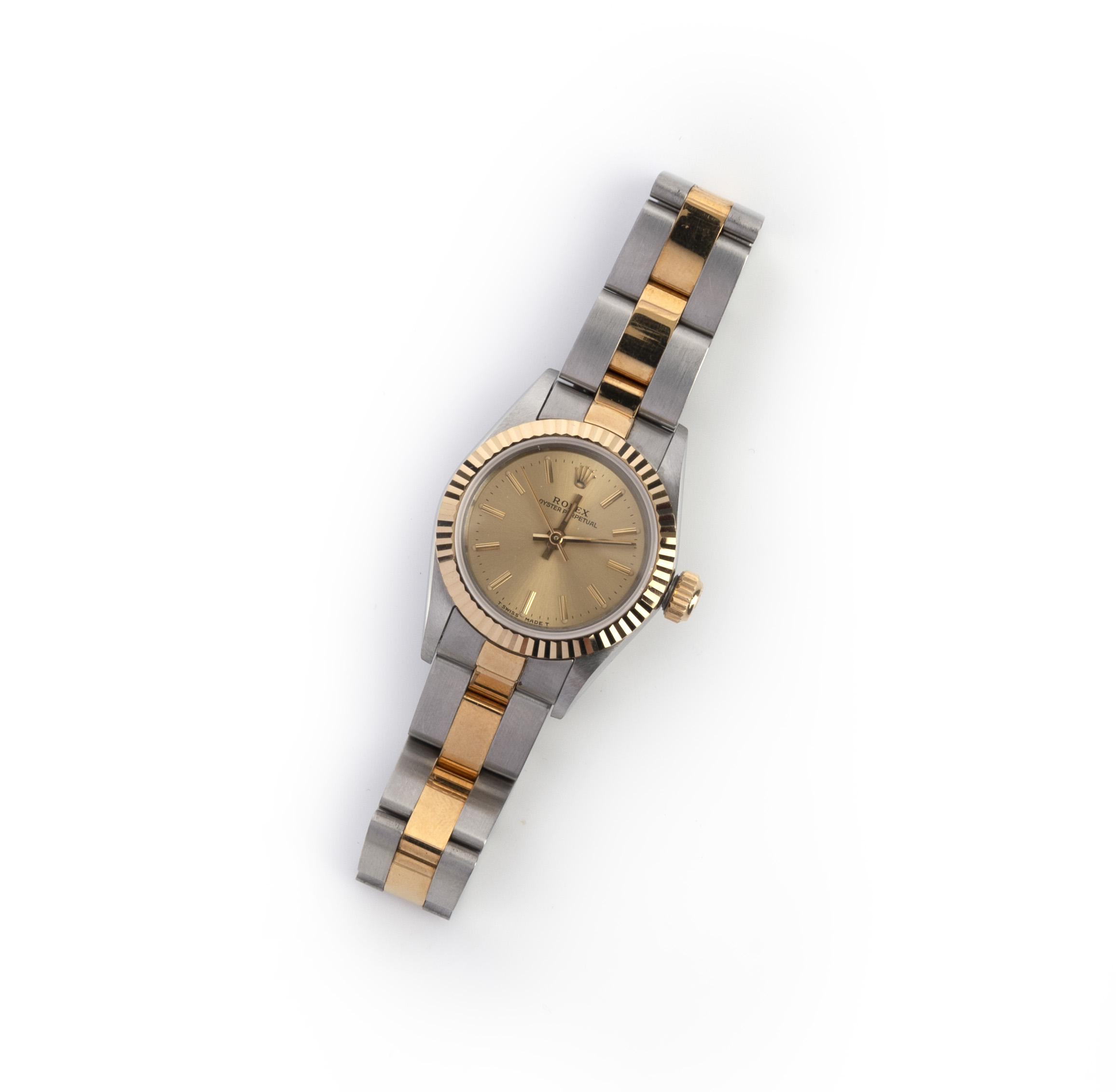 Rolex, a lady's stainless steel wristwatch, 'Oyster Perpetual', ref 67193, circa 1991, the brushed gilt dial with baton indicators, to a bicoloured stainless steel bezel and link bracelet, case width 2.9cm, model no 67193, case no. L578264, dial and clasp signed Rolex, original box and papers
