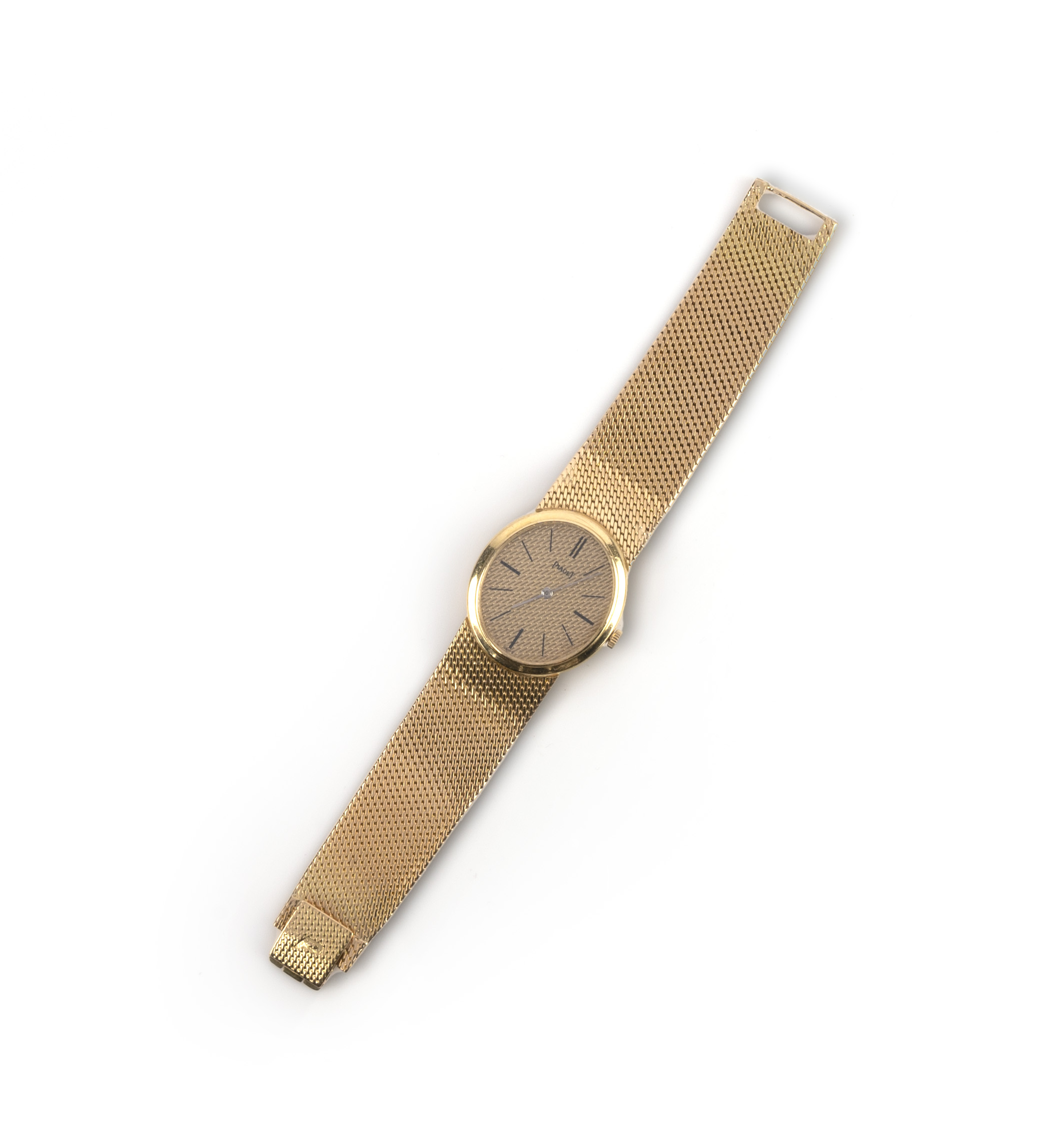 Piaget, a lady's gold wristwatch, signed gold dial with baton numerals, manual movement, case numbered 9821 811 and 129570, on 18ct gold mesh bracelet, length 14cm, Piaget box