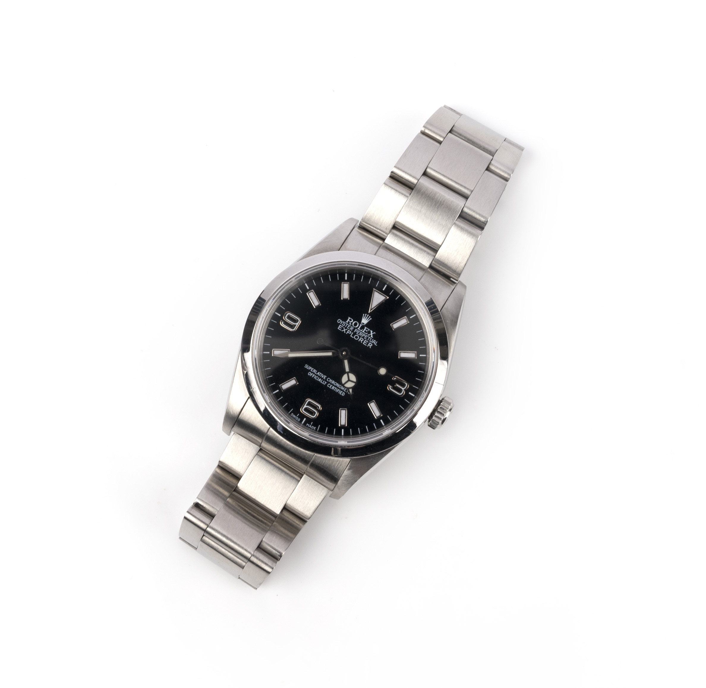 Rolex, a gentleman's stainless steel wristwatch, 'Explorer Mark 1', ref 14270, circa 1992, the black dial with baton indicators, and numerals at 3, 9 and 6, to a stainless steel bezel and link bracelet, case width 35cm, model no 14270, case no. N440254, dial and clasp signed Rolex, original box and papers