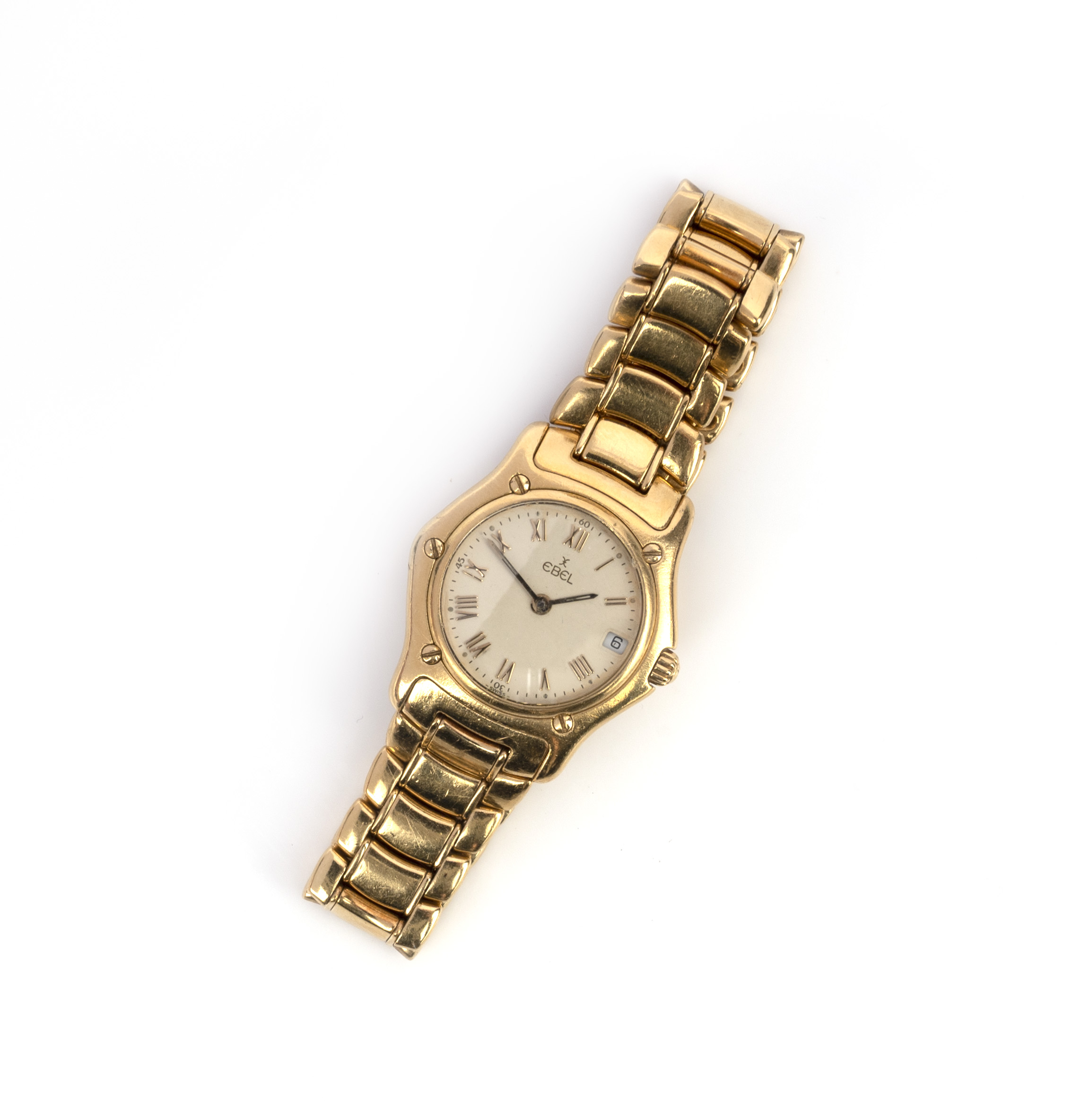 Ebel, a lady's gold wristwatch, '1911', ref. 888901, the circular cream dial with Roman numeral indicators and date wheel, within a gold bezel decorated with screw heads, to an integrated gold link bracelet, case width 2.6cm, bracelet length 15cm, quartz movement, signed Ebel 1911, numbered 88901 and 72100067, Swiss assay marks for 18ct gold
