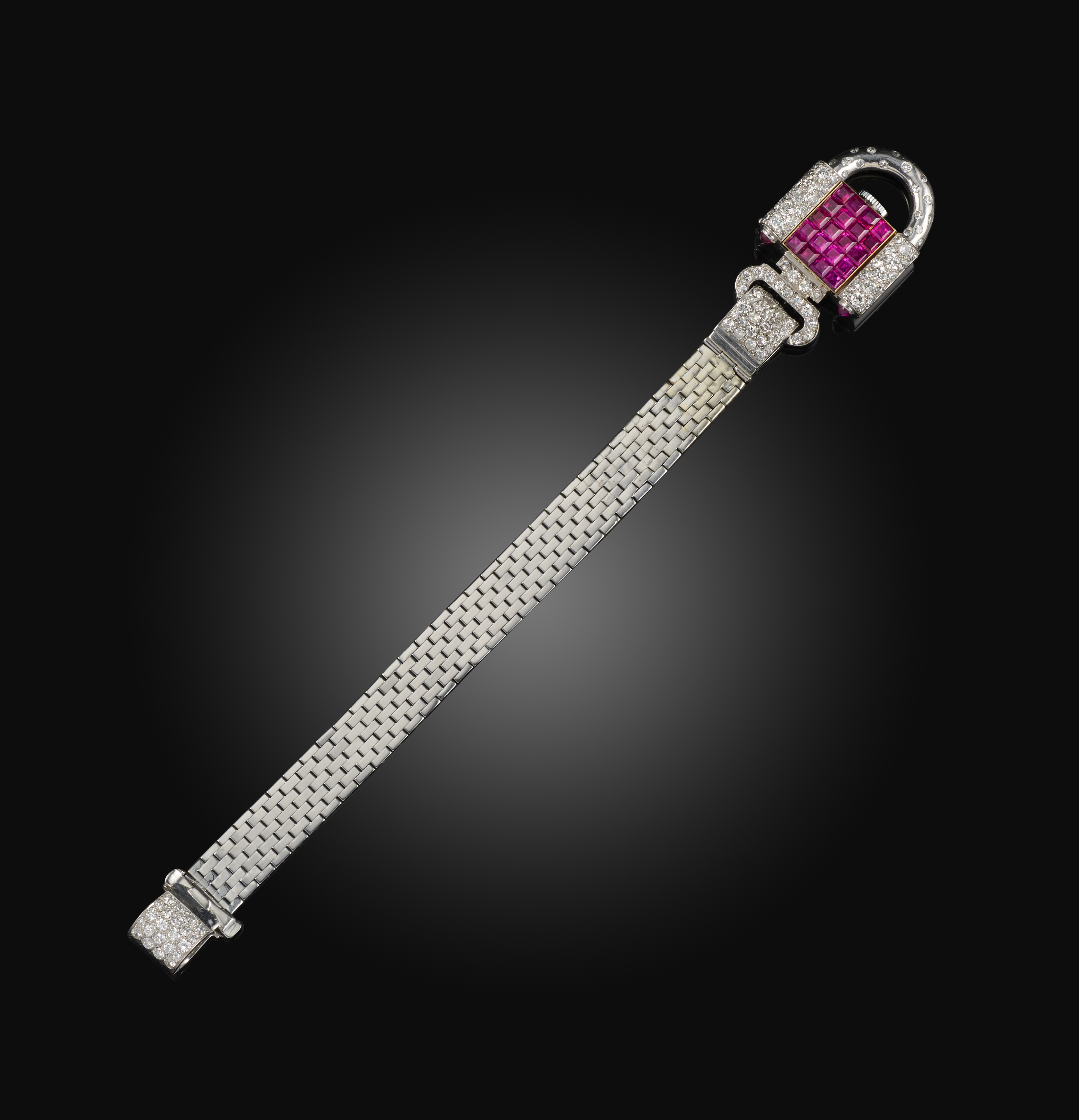 A ruby and diamond watch, mid 20th century, of padlock design, set with circular-cut diamonds, the central panel of calibré-cut rubies opening to reveal a square silvered dial with black enamel indicators and blued steel hands, to a brick link strap, mounted in platinum and white gold, case width 2.2cm, bracelet length 17cm, manual winding movement