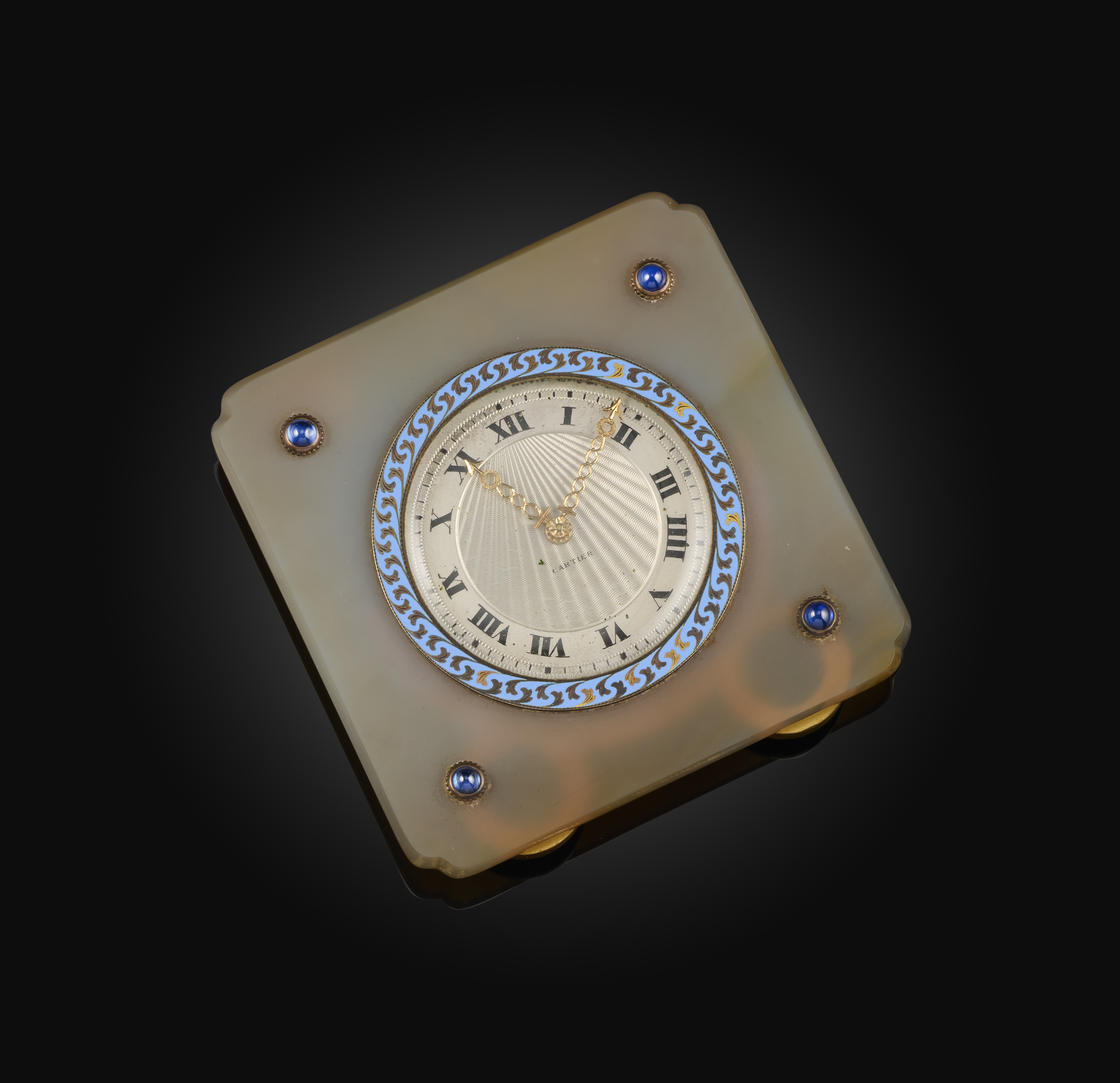 Cartier, an Art Deco agate, sapphire and enamel desk timepiece, circa 1920, the silvered dial of guilloché design, with black enamel Roman numeral indicators and openwork gold hands, within a bezel applied with light blue enamel with foliate motifs in reserve, to an agate frame of square outline with inverted corners, accented to each corner with a cabochon sapphire, the reverse with a gilt metal strut, dial 4.1cm diameter, frame 7.3 x 7.4cm, dial signed Cartier, back signed Cartier NY and EW&C Co. Inc France, numbered 399