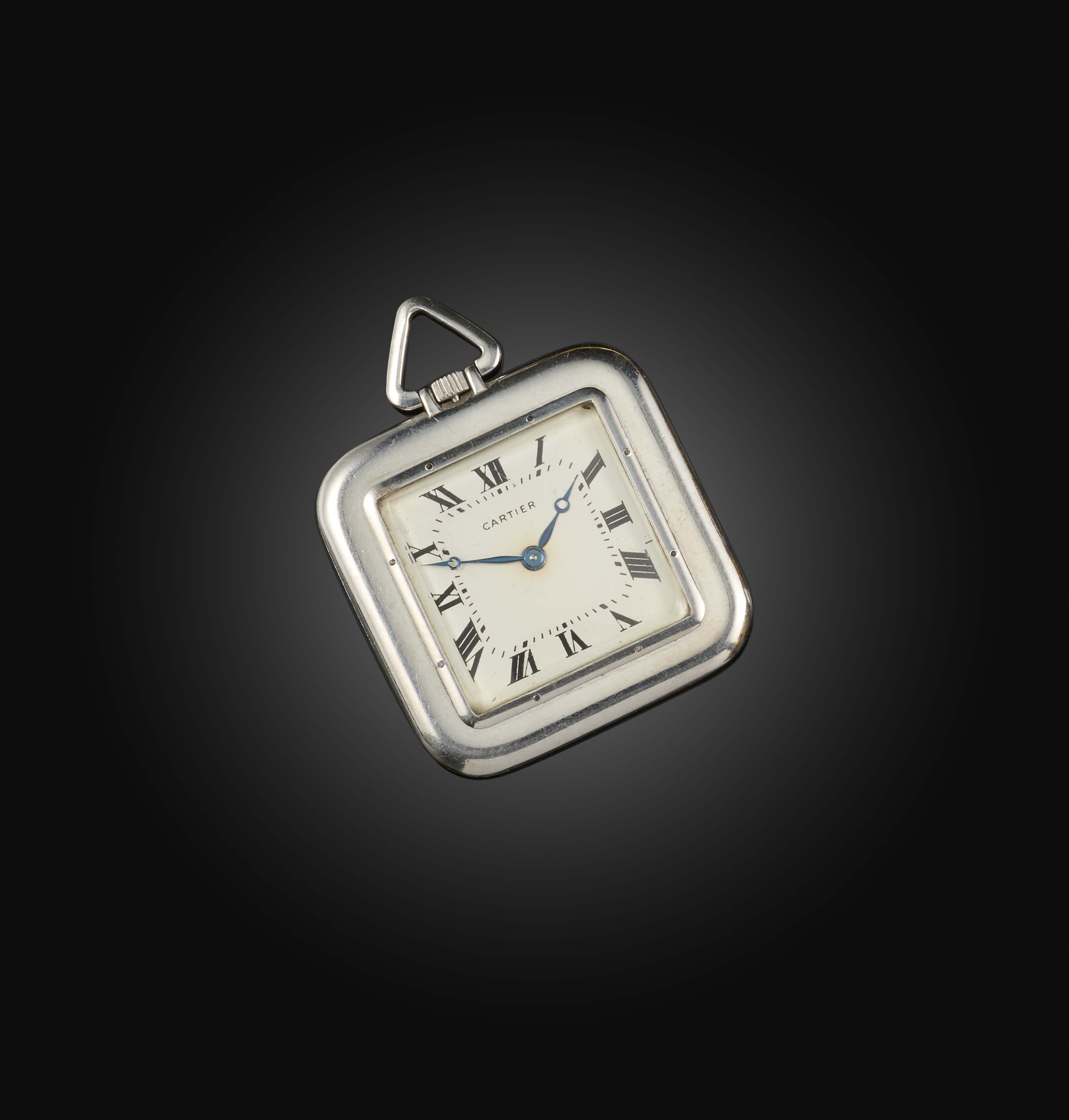 Cartier, a white gold fob watch, mid 20th century, the square white dial with black Roman numeral indicators and blue steel hands, within a plain square case, to a triangular suspension hoop, length 5.2cm including suspension hoop, manual winding movement, dial signed Cartier, movement signed European Clock and Watch Co., interior of case with French assay mark for 18ct gold, maker's mark EJ with hour glass for Jaeger, numbered 10253, 3743 and 4517, case back interior numbered 5253 and 3743, later case stamped Cartier