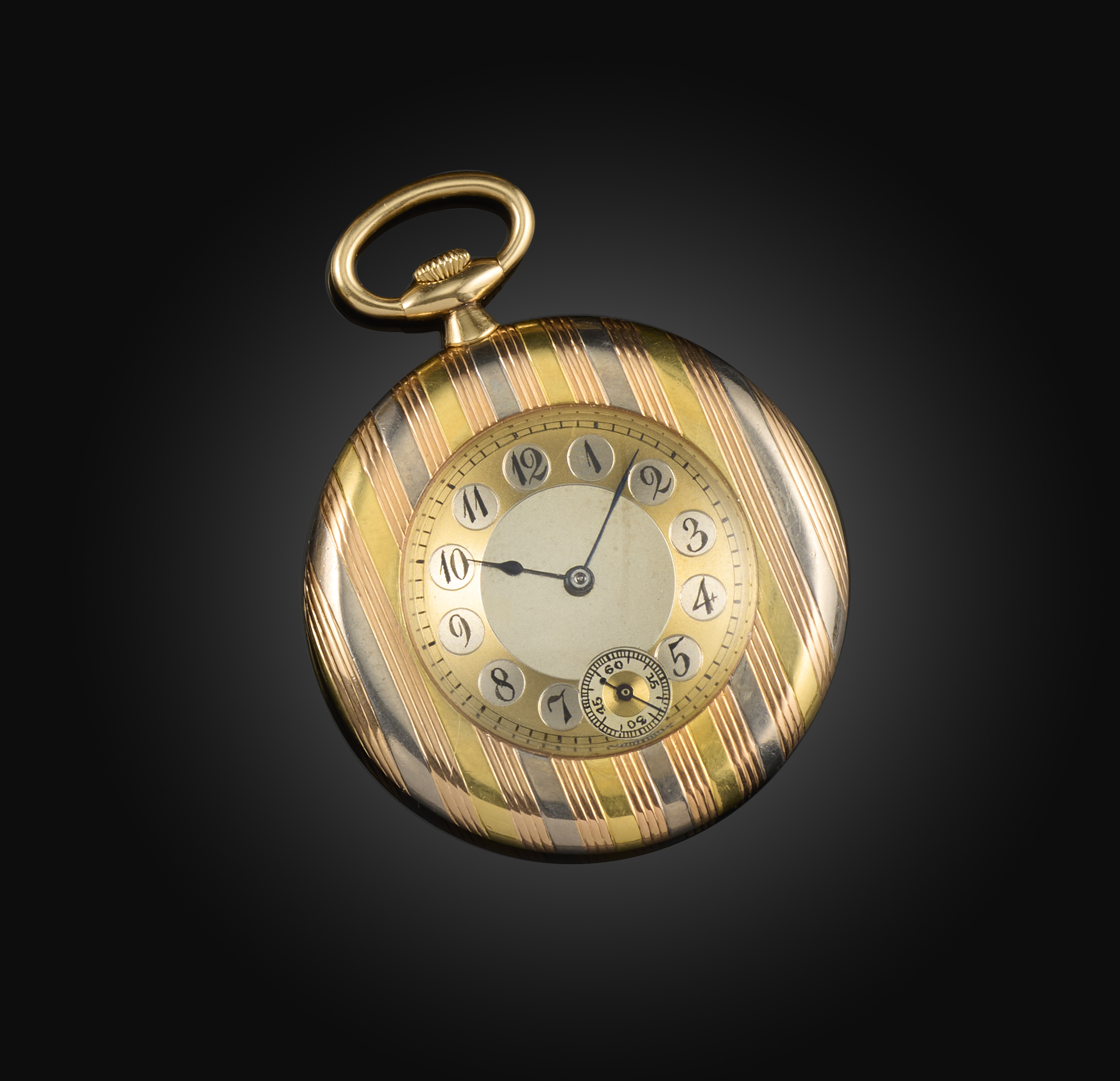 No reserve - An early 20th Century three colour gold, stem wind, dress pocket watch, the reduced dial with black Arabic numerals on discs, subsidiary seconds dial, with plain and reeded ilistrations and fine engraving to the reverse, dated 1915