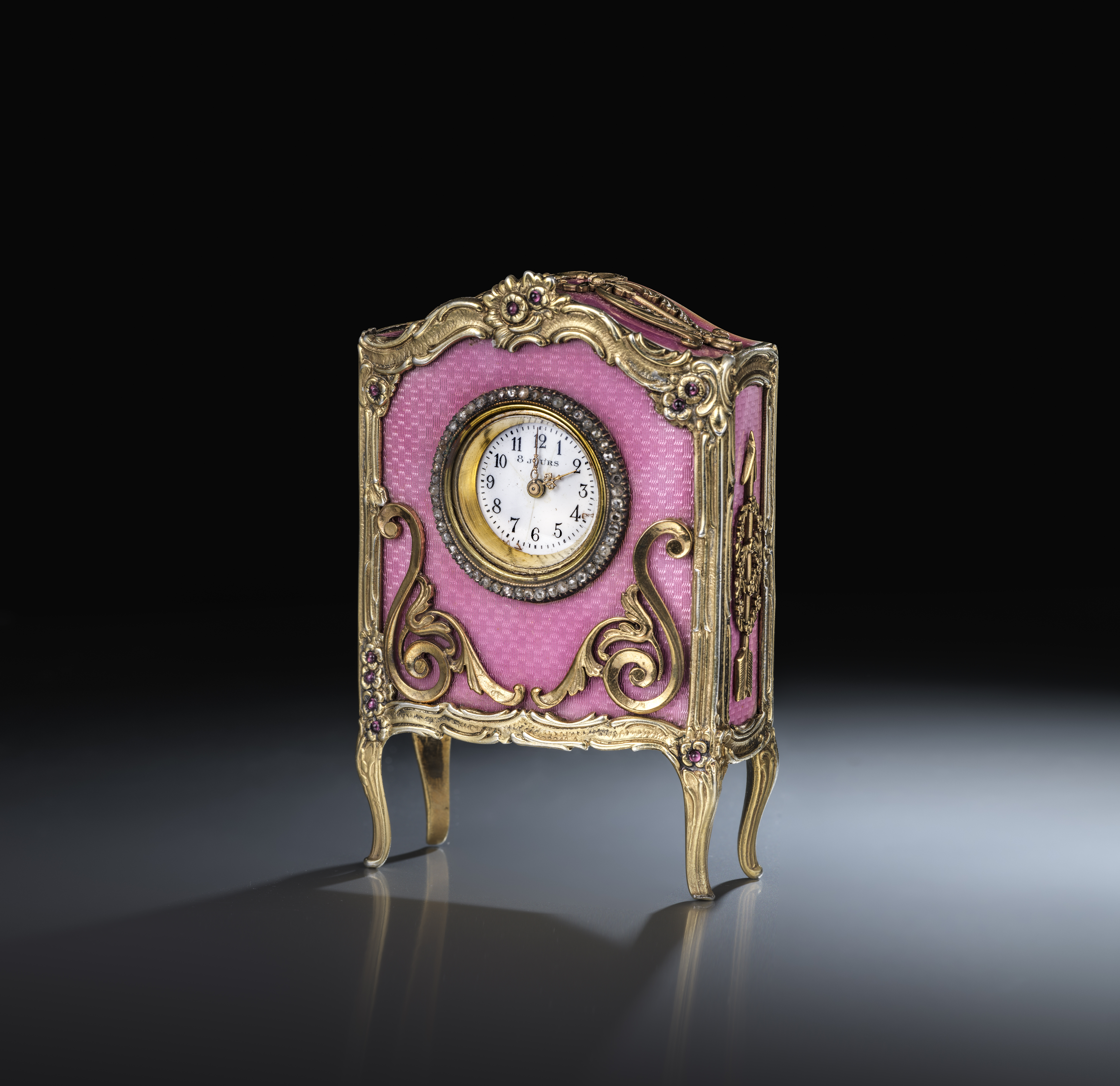 Boucheron, a rare enamel, ruby and diamond desk timepiece, early 20th century, the circular white enamel dial inscribed '8 Jours', with black enamel indicators and gold hands, within a border of rose-cut diamonds to a gilt silver case designed in the Rococo revival style on four cabriole legs, applied to the front and sides with pink guilloché enamel, accented by floral motifs set with cabochon rubies, measuring 8.5 x 5.6 x 2.4cm, reverse signed Boucheron, French sponsor's mark LK with cockerel, French assay marks for silver, stamped 900, gilt metal winding key, original fitted case stamped Boucheron