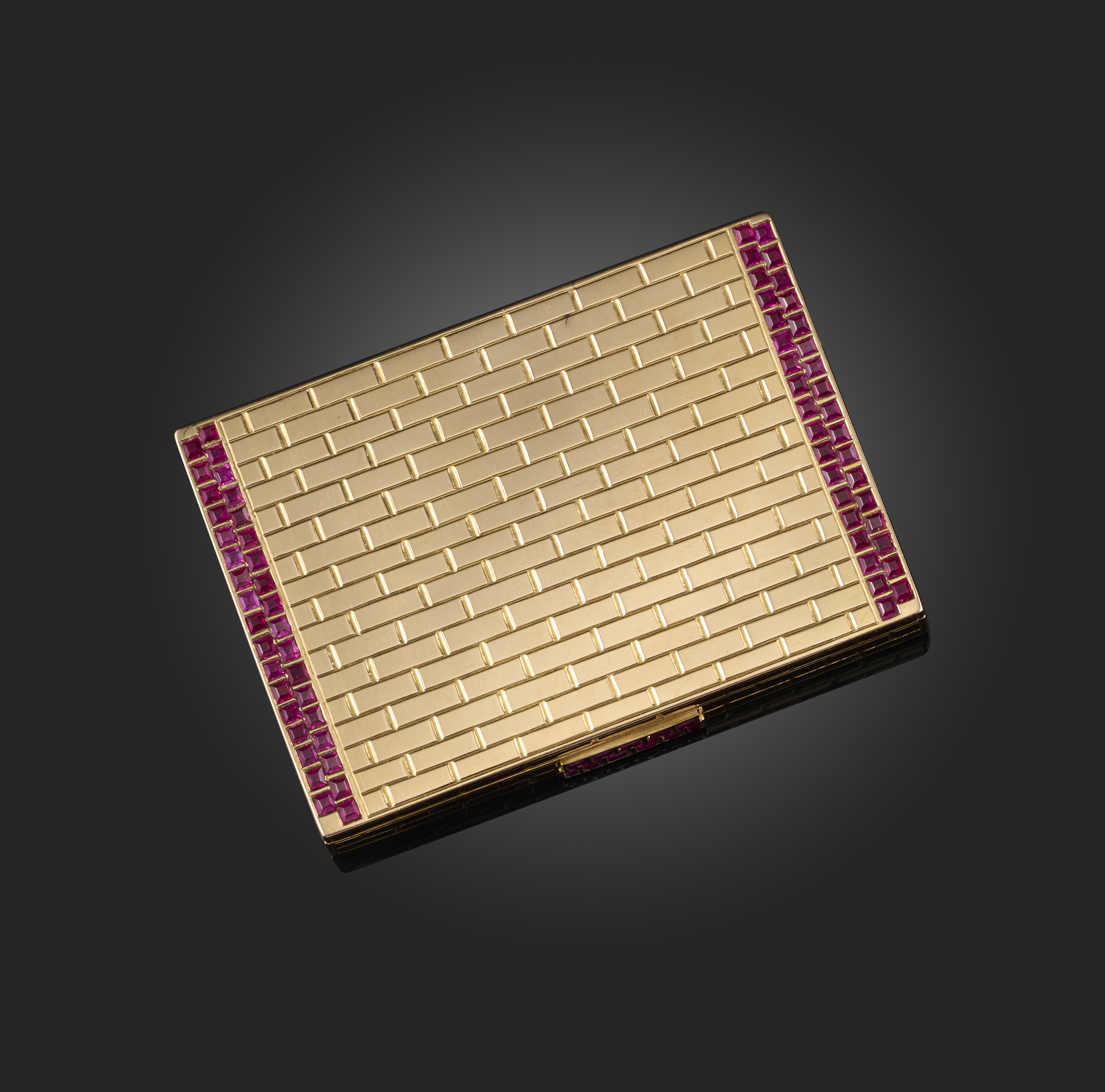 A gold and synthetic ruby cigarette case, mid 20th century, the exterior engraved with brick motifs, the push piece and lid set at each edge with lines of calibré-cut rubies, opening to reveal a plain interior, measuring 8.1 x 5.5 x 1.1cm, gross weight 105 grams