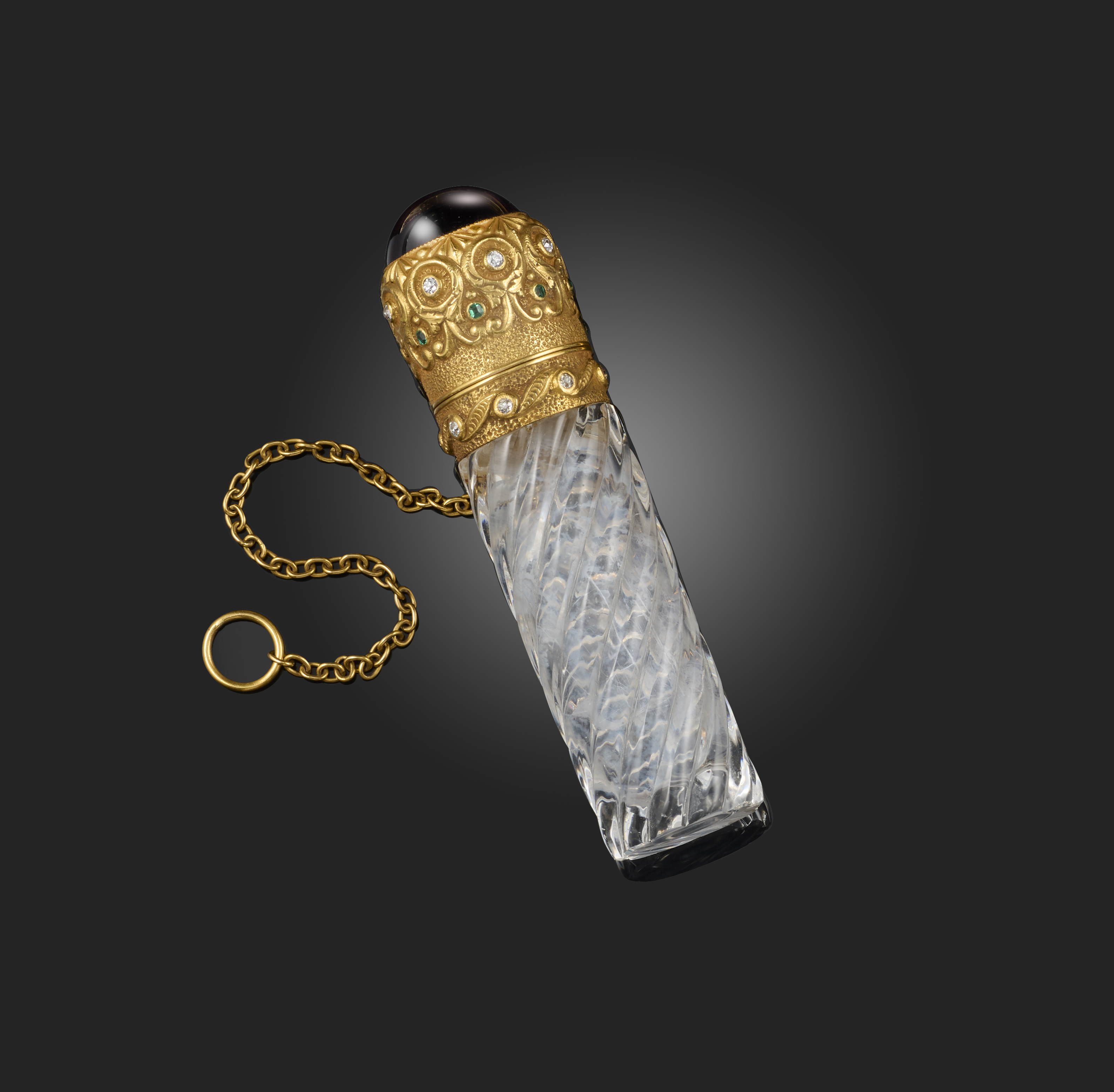 An amethyst, emerald and diamond scent bottle, late 19th/early 20th century, the twisted cylindrical glass bottle mounted in textured gold of foliate design with a hinged lid, set with a cabochon amethyst, circular-cut diamonds and step-cut emeralds, length 8.8cm