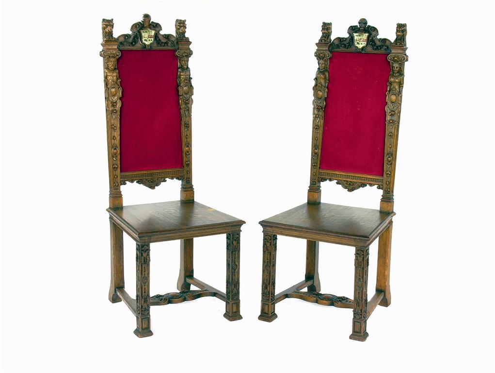 A pair of French carved oak side chairs, the rectangular backs with relief carved shaped crests centred a painted armorial with knights helmet above flanked by masks and terms, the seat on conforming square legs united by an H stretcher. (2)