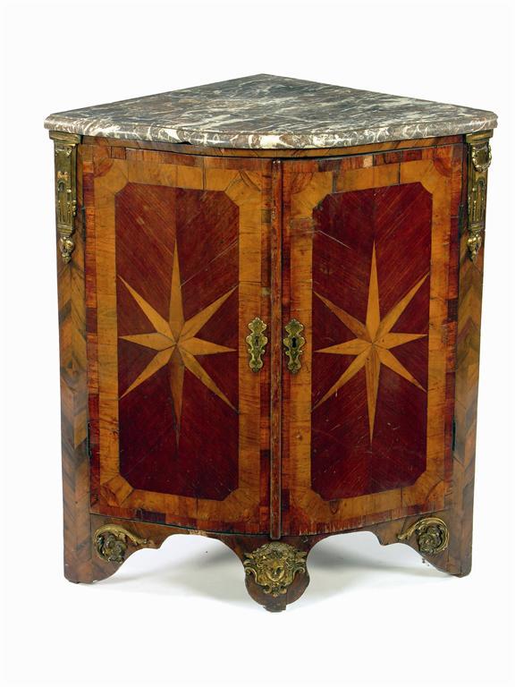 An 18th century continental ecogniere, with gilt brass mounts, the moulded edge serpentine front marble top above a pair of rosewood and walnut banded doors with parquetry stars, enclosing two shelves, 32.25in (82cm) h, 29in (73.5cm) w, 20.75in (52.5cm) d.