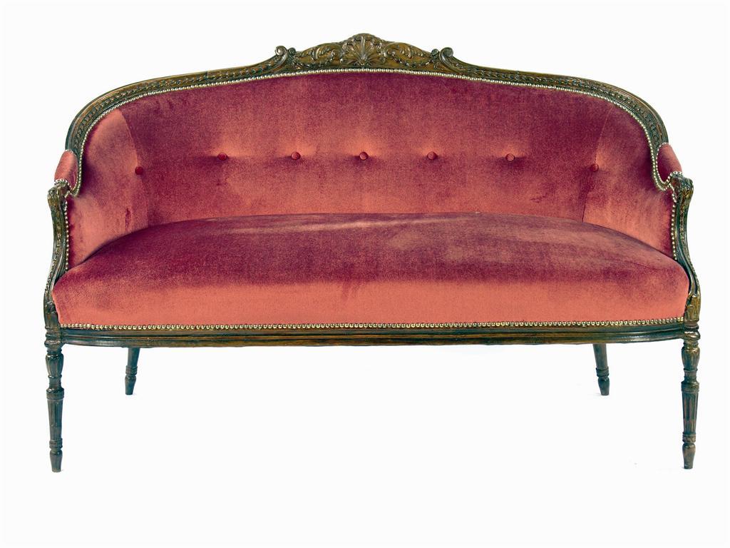 A late 19th century carved beechwood frame settee, the shaped back centred a palmette to foliage and husk decoration, later upholstered with brass studding, the bow front seats on vase turned and stiff leaf legs, restoration, 36.25in (92cm) h, 57in (144.5cm) w, 30in (76cm) d.