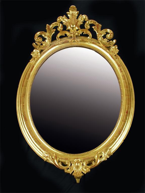 A French oval giltwood wall mirror, with a foliage spray surmount and conforming base, 55.5 x 37in (141 x 94cm).