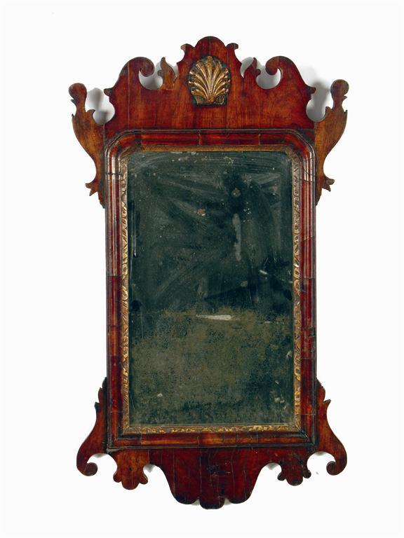 A walnut fret framed mirror, the rectangular plate within a gilt and moulded border, the surmount with an applied double shelf to a shaped base, 18th century and later, 30.25 x 17.25in (76.5 x 44cm).
