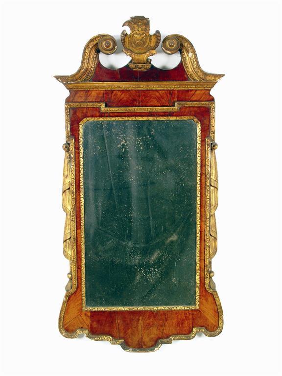 An 18th century walnut, parcel giltwood and gesso wall mirror, the swan neck pediment centred a cartouche, above a rectangular plate with moulded outline and draped sides, 52.5 x 26in (133.5 x 26cm)