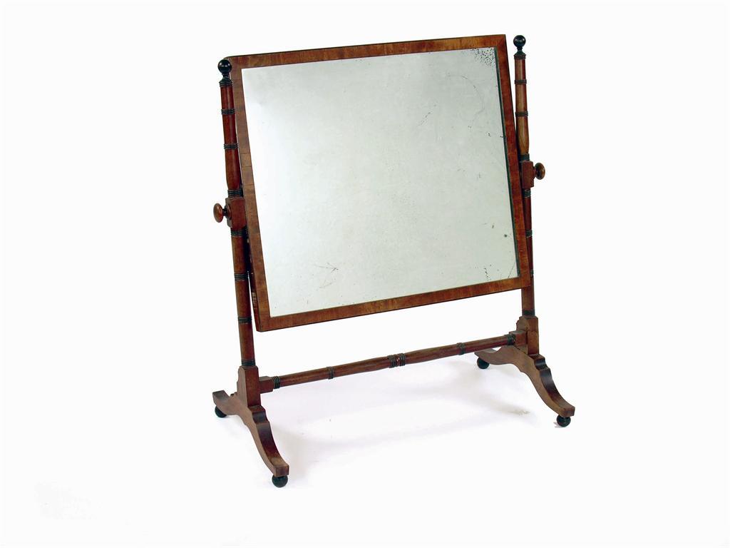 A 19th century mahogany swing frame mirror, with part ebonised ring supports, 30in (76cm) h, 24.5in (62cm) w.