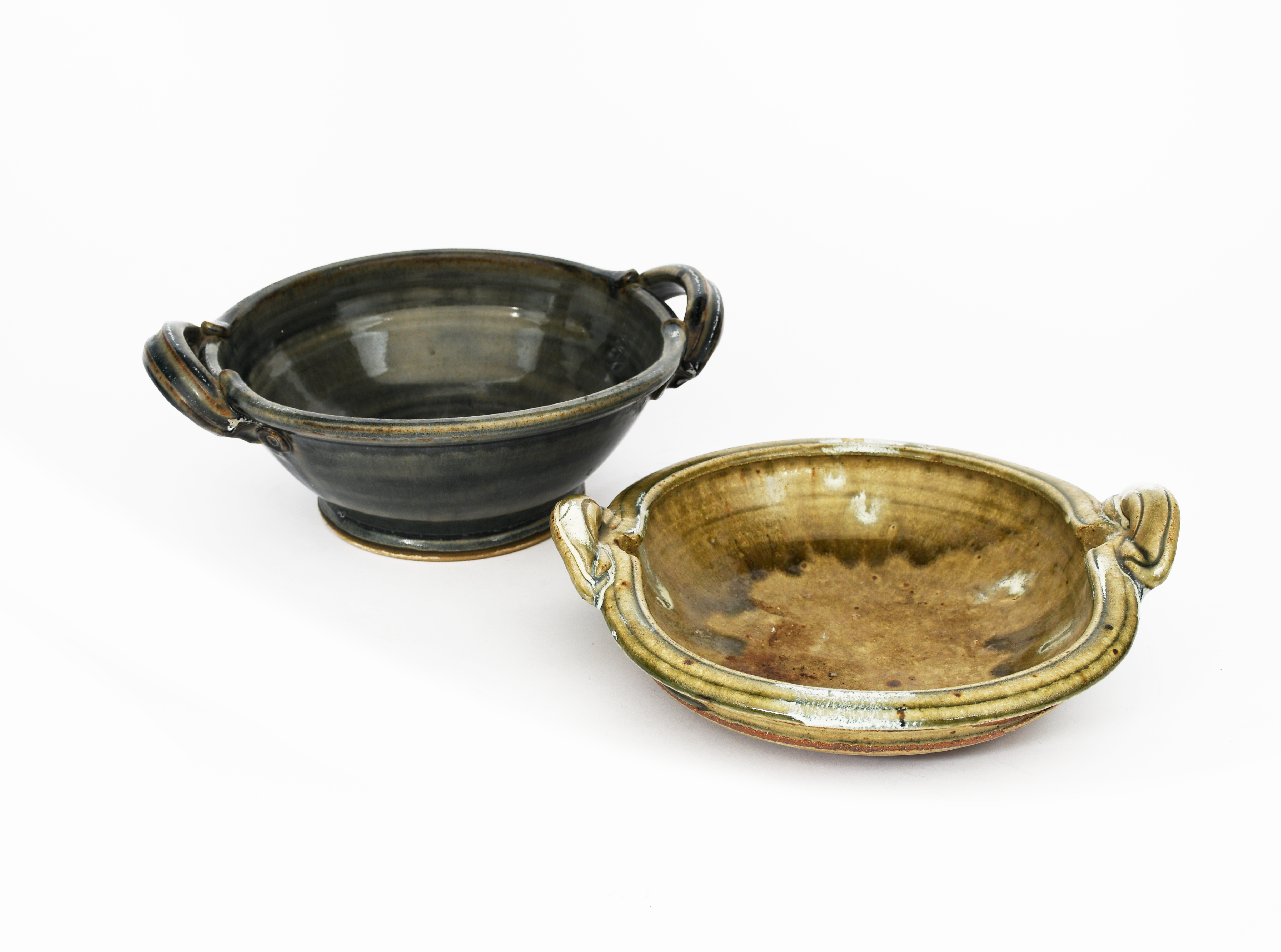 a stoneware twin-handled bowl, covered in an ash glaze, and a similar twin-handled bowl by Tessa Fuchs,