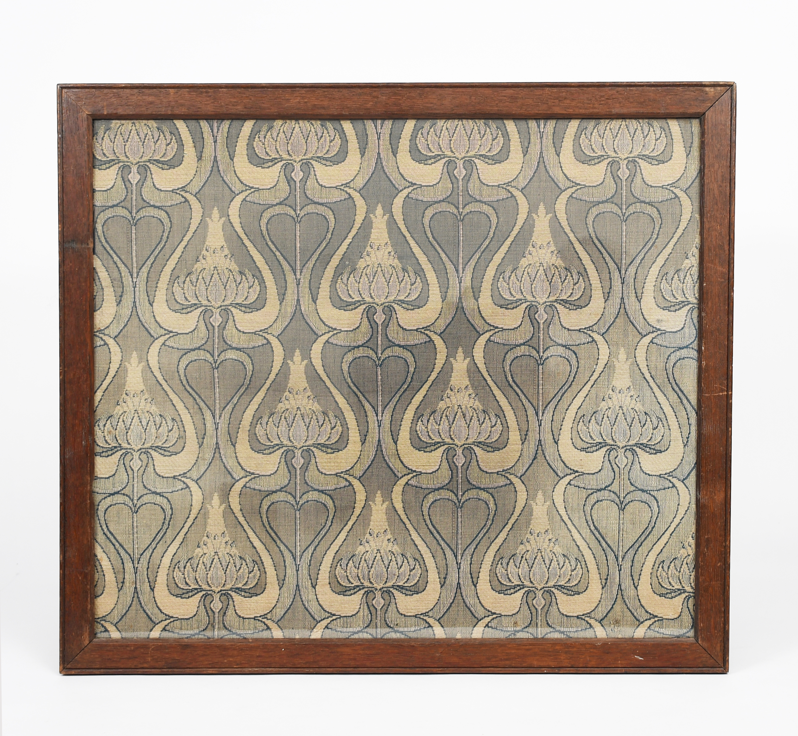 An Art Nouveau textile panel, decorated with simple flower stem repeat, in green and blue, framed