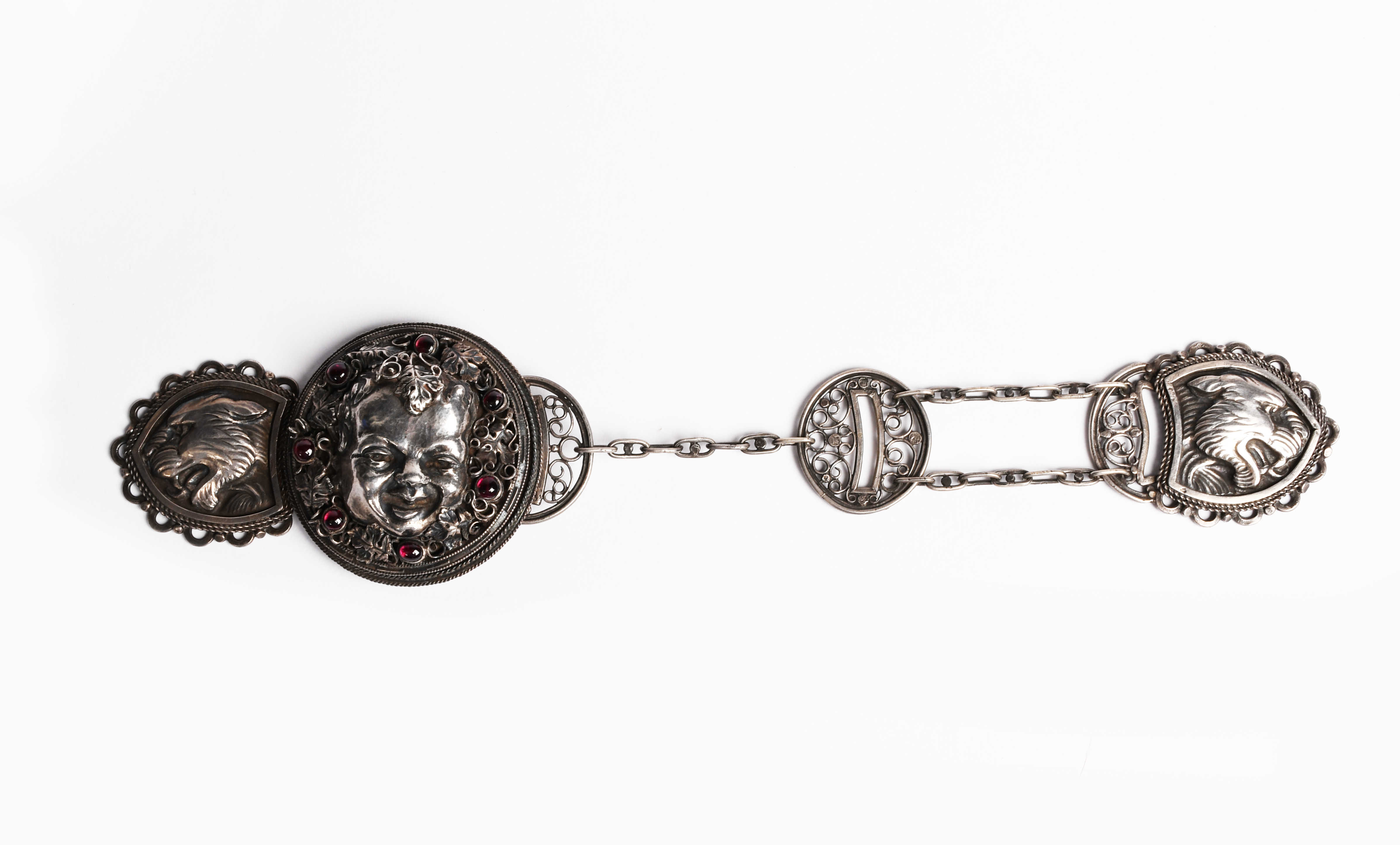 An Arts and Crafts silver cloak clasp by Charles Thomas, circular cast in relief with a Bacchanalian child inside a vine border set with pink glass cabochon, inside filigree panels and shield shape panels cast with big-cat heads stamped marks, London 1938, 27.5cm. wide