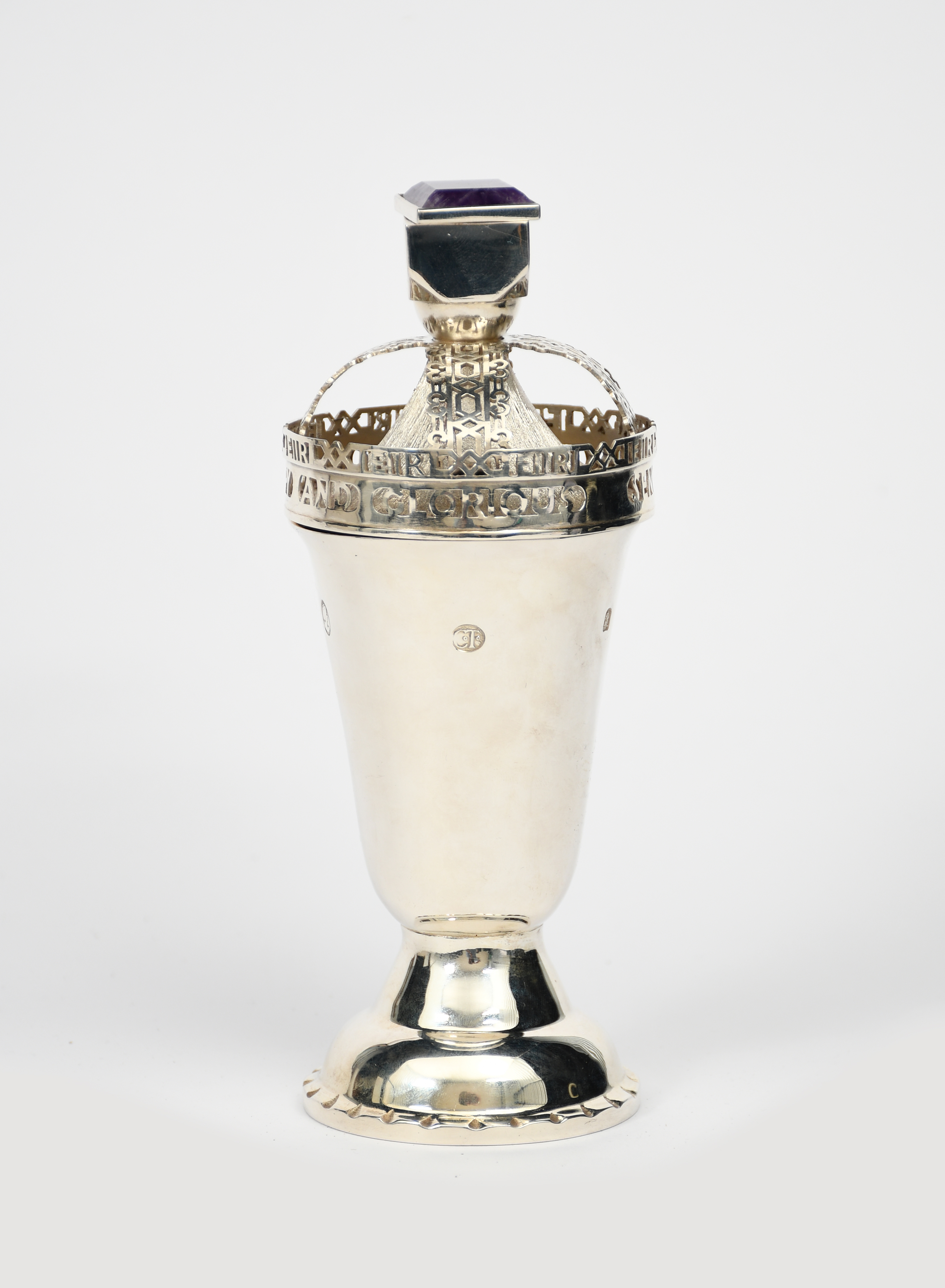 A Royal commemorative silver and amethyst Elizabeth II Coronation cup and cover by Charles Thomas, 1953, the footed, flaring body supporting pierced and chased cover, the rim inscribed EIIR Send Her Victorious Happy and Glorious, Heres a Health to the Queen and a Lasting Peace, the finial set with square amethyst panel, stamped marks, London 1953, (15oz approx), 20.5cm. high, (2)