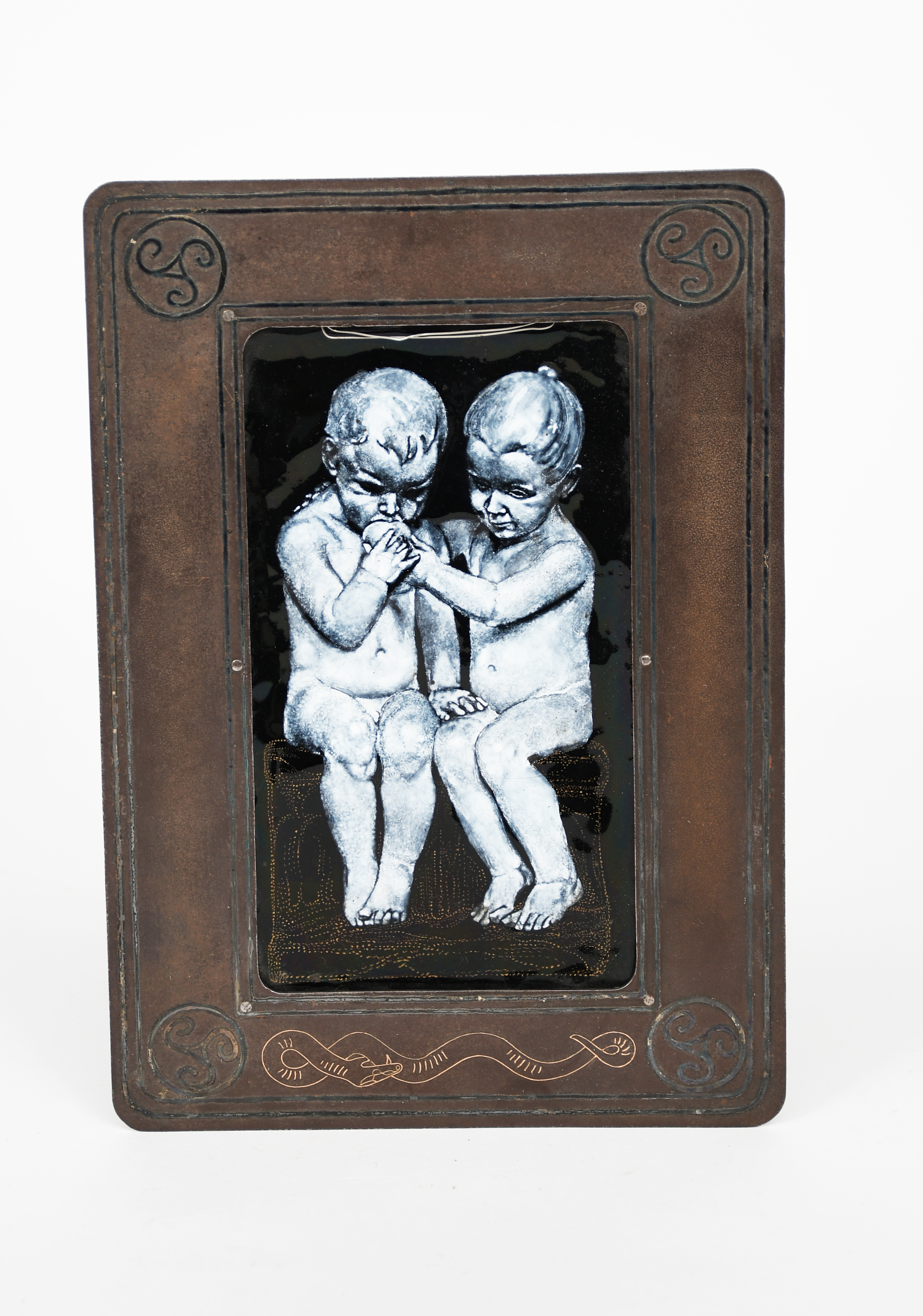 A Limoges enamel panel of two young boys, painted en grisaille, one biting into an apple, set in a