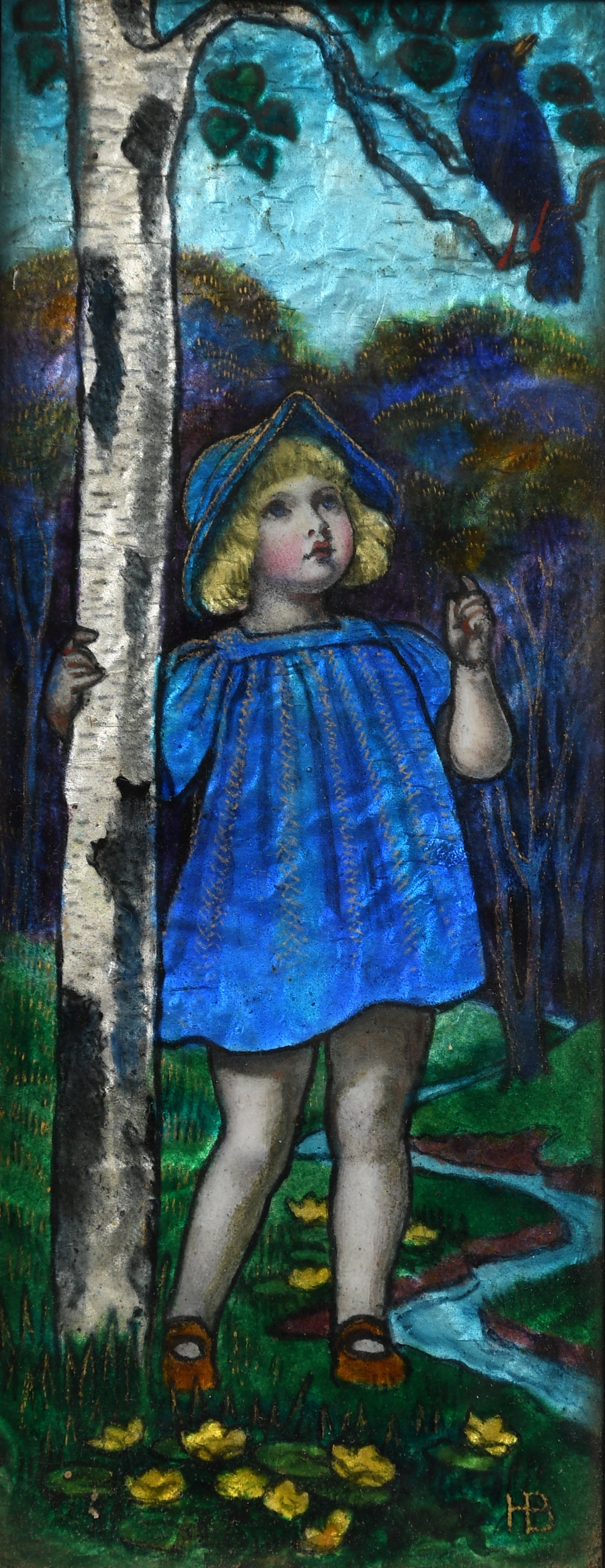 An enamel panel of a young girl in a blue dress by HB, the rectangular panel enamelled in colours,