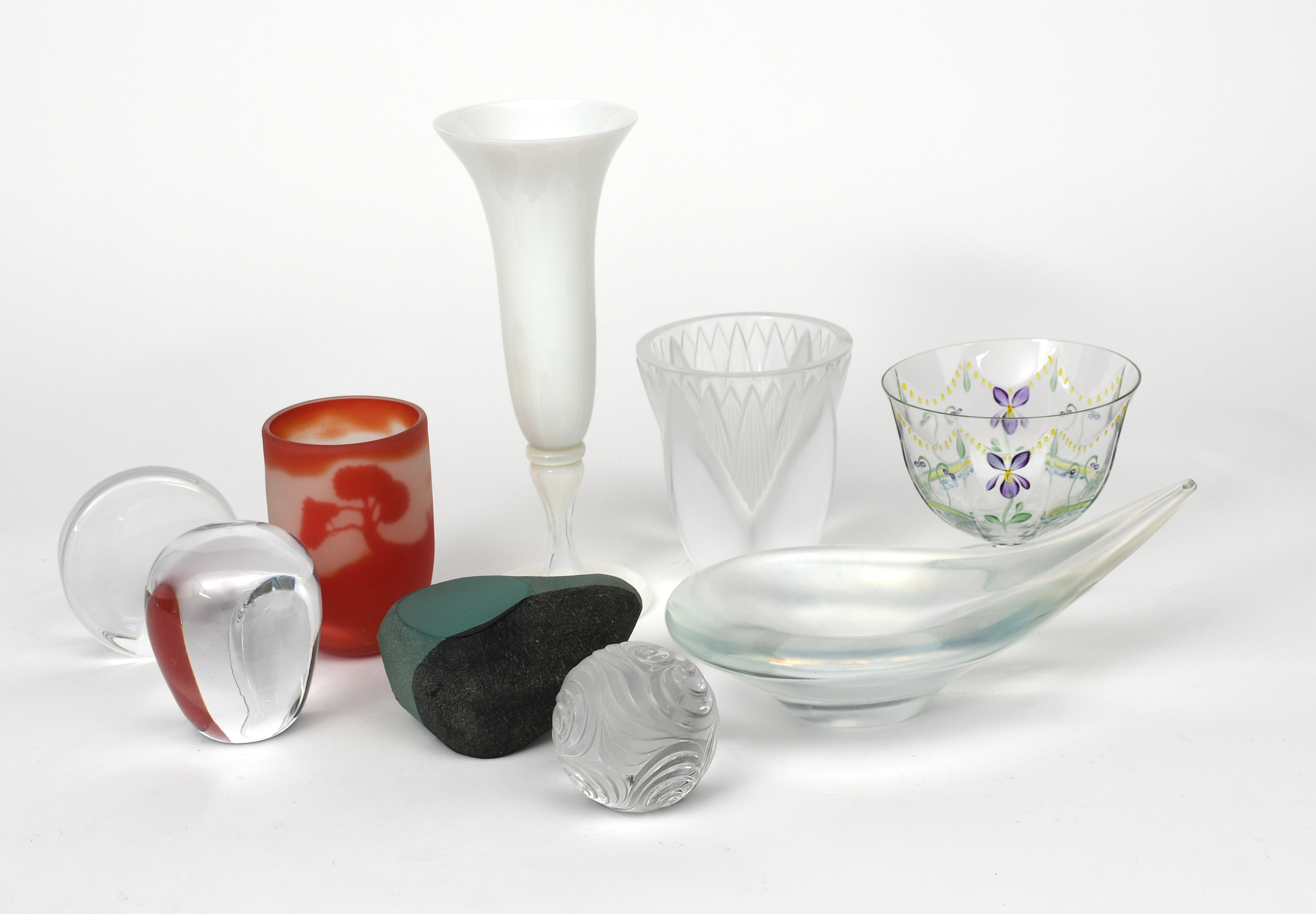 an engraved spherical paperweight, 1980, a Venini glass teardrop dish, with lustre finish, a Lalique clear and frosted Lotus flower glass vase and six other glass items,