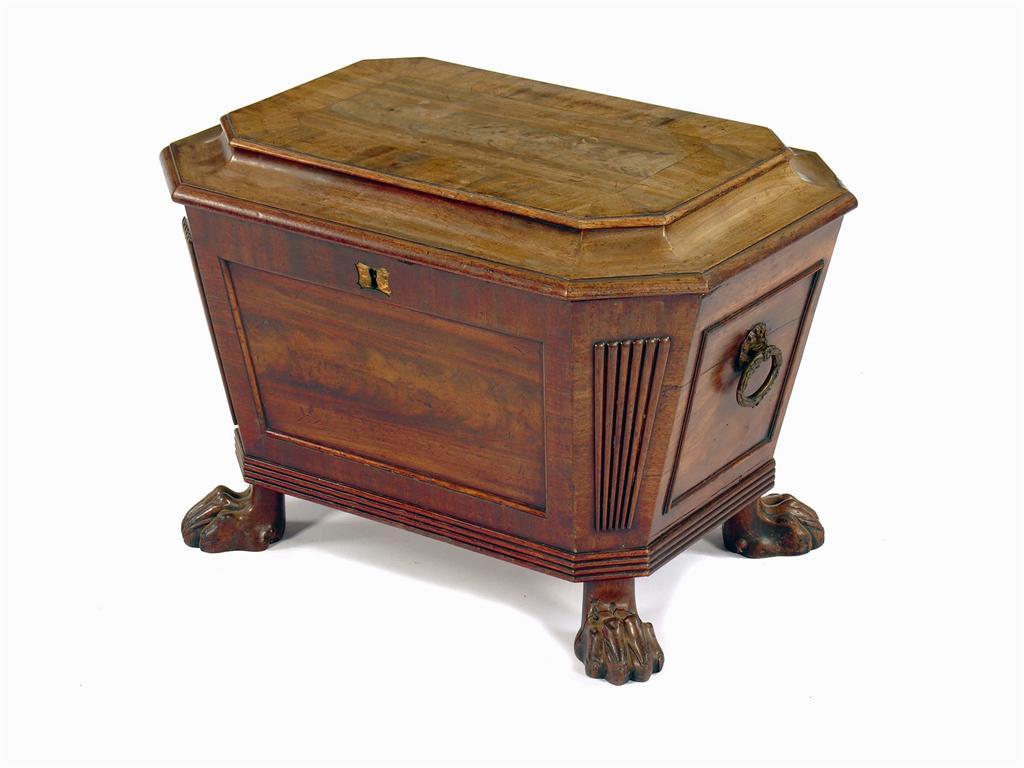 A George IV mahogany sarcophagus wine cooler, the cross banded sloping top above panelled side and a plain back with ribbed angles to a reed edge on carved paw feet, one damaged, previously on castors, the interior previously lined, with bung, 17.25in (44cm) h, 25.25in (64cm) w, 18in (45.5cm) d.