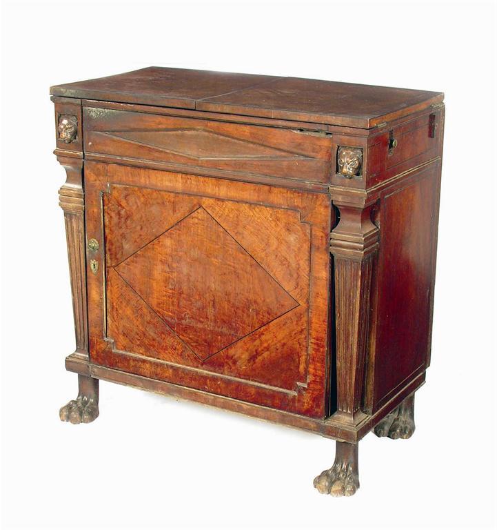 A George IV mahogany serving table, inlaid ebonised stringing, the banded hinged top on lopers, above a panelled cupboard door, enclosing a shelf, flanked by carved lioness masks on waisted and fluted tapering columns on carved paw feet, 36.25in (92cm) h, 36in (91.5cm) w, 22in (56cm) d.