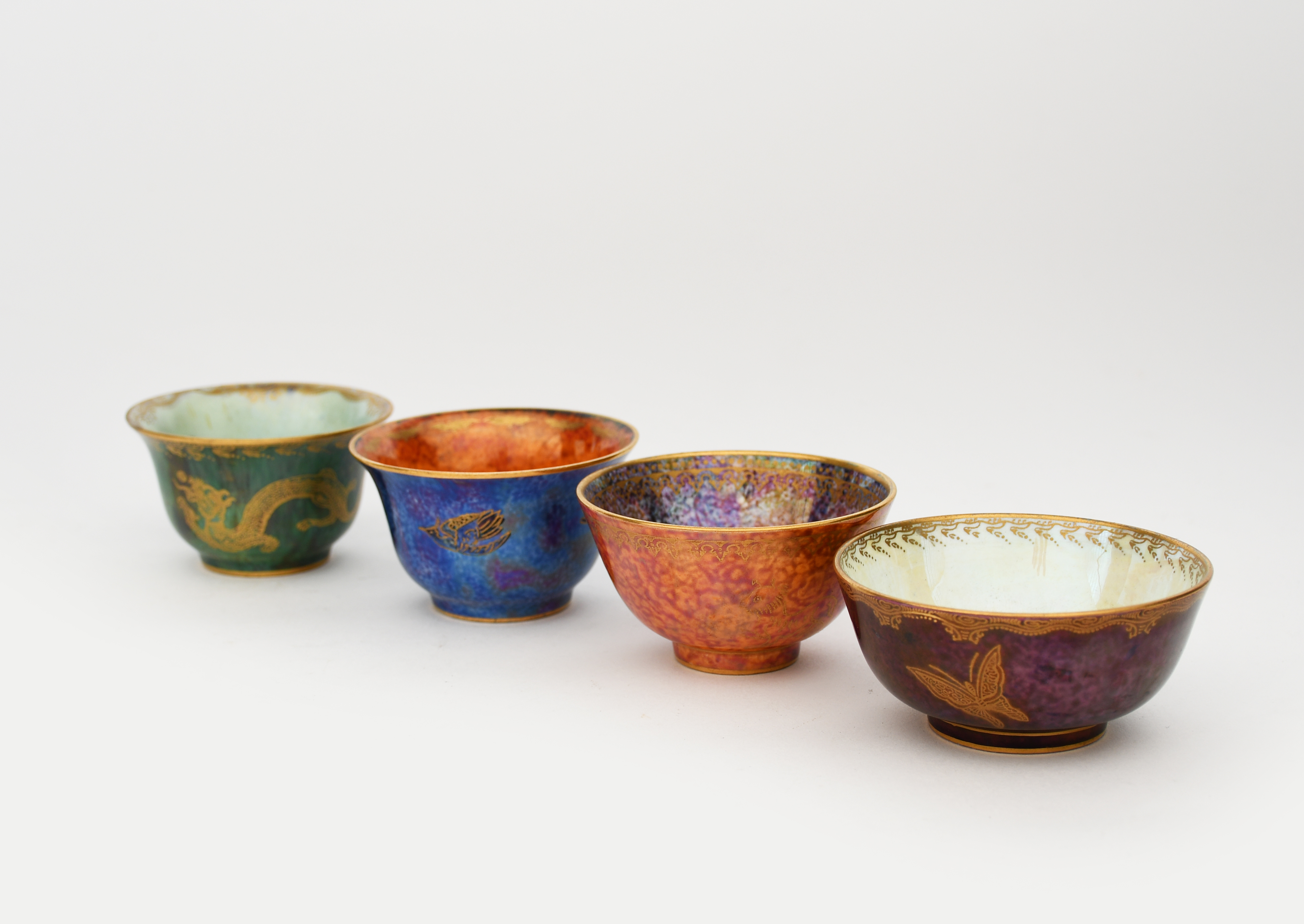 A Wedgwood Butterfly lustre miniature bowl designed by Daisy Makeig-Jones, printed in gilt on a purple lustre ground, another Dragon lustre miniature bowl, two other Wedgwood lustre miniature bowls, a Crown Devon vase and cover and four various lustre miniature bowls, printed factory marks, 8cm. diam. (10)