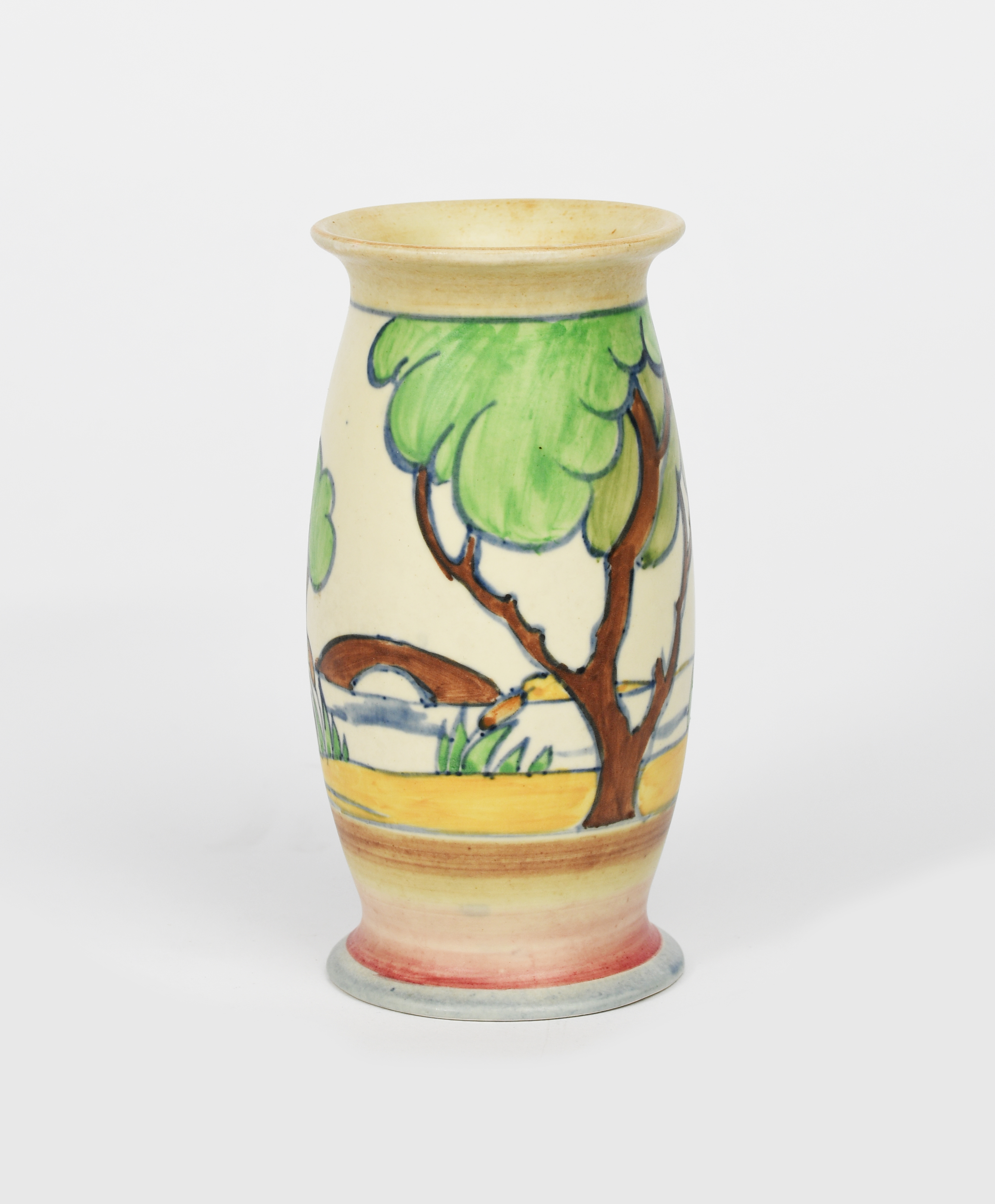 'Gloria Bridge' a Clarice Cliff Bizarre vase, shape no.265, painted in pastel colours, printed